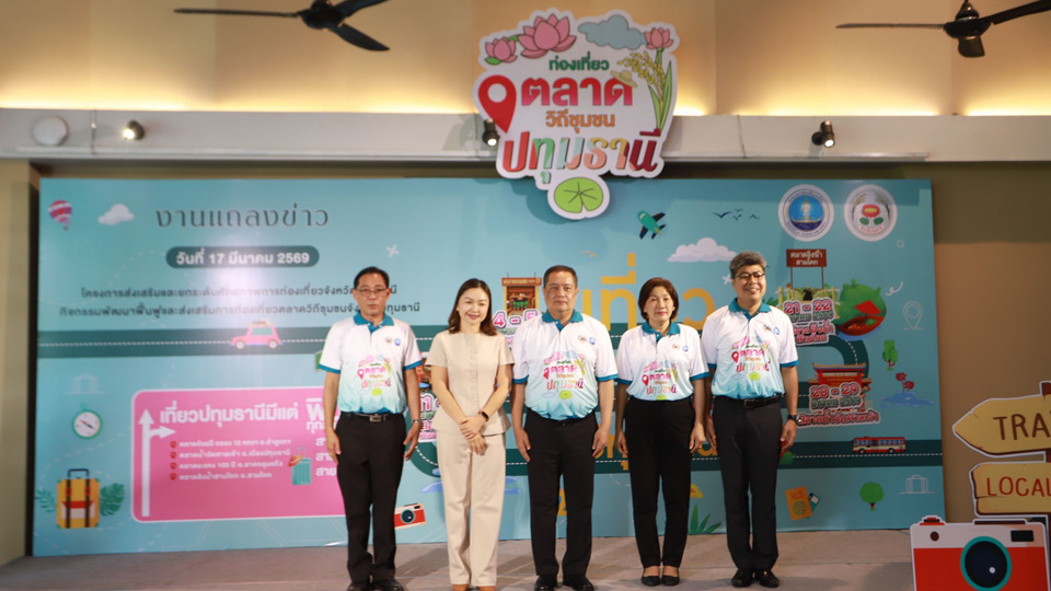 วันที่ 17 มี.ค.69 เวลา 13.30 น.นายเอกวิทย์ มีเพียร ผู้ว่าราชการจังหวัดปทุมธานี เป็นประธานแถลงข่าวโครงการพัฒนาศักยภาพและยกระดับการท่องเที่ยวจังหวัดปทุมธานี กิจกรรมพัฒนาฟื้นฟูและส่งเสริมการท่องเที่ยวตลาดวิถีชุมชนจังหวัดปทุมธานี พร้อมด้วยนางสาวแสงจันทร์ แก้วประทุมรัสมี ท่องเที่ยวและกีฬาจังหวัดปทุมธานี นายคเชนทร์ชัย แพงจันทร์ พัฒนาการจังหวัดปทุมธานี นายอภิรัตน์ ทวีทรัพย์ รองผู้อำนวยการการท่องเที่ยวแห่งประเทศไทย สำนักงานกรุงเทพมหานคร เข้าร่วมแถลงข่าว โดยมีหัวหน้าส่วนราชการ เครือข่ายท่องเที่ยวและกีฬาจังหวัดปทุมธานี และหน่วยงานที่เกี่ยวข้องเข้าร่วมงาน
