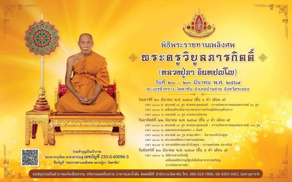 เมื่อเวลา 13.00 น. วันที่ 21 มีนาคม 2569 ที่วัดตาขัน ต.ตาขัน อ.บ้านค่าย จ.ระยอง กลุ่มพิธีการศพที่ได้รับพระราชทาน สำนักงานวัฒนธรรมจังหวัดระยอง ร่วมถวายงานในพิธีเคลื่อนสรีระสังขาร พระครูวิบูลภารกิตติ์ (หลวงปู่ภา อินฺทปัญฺโญ) จากศาลาการเปรียญไปยังเมรุชั่วคราว เพื่อประกอบพิธีพระราชทานเพลิงศพตามกำหนด