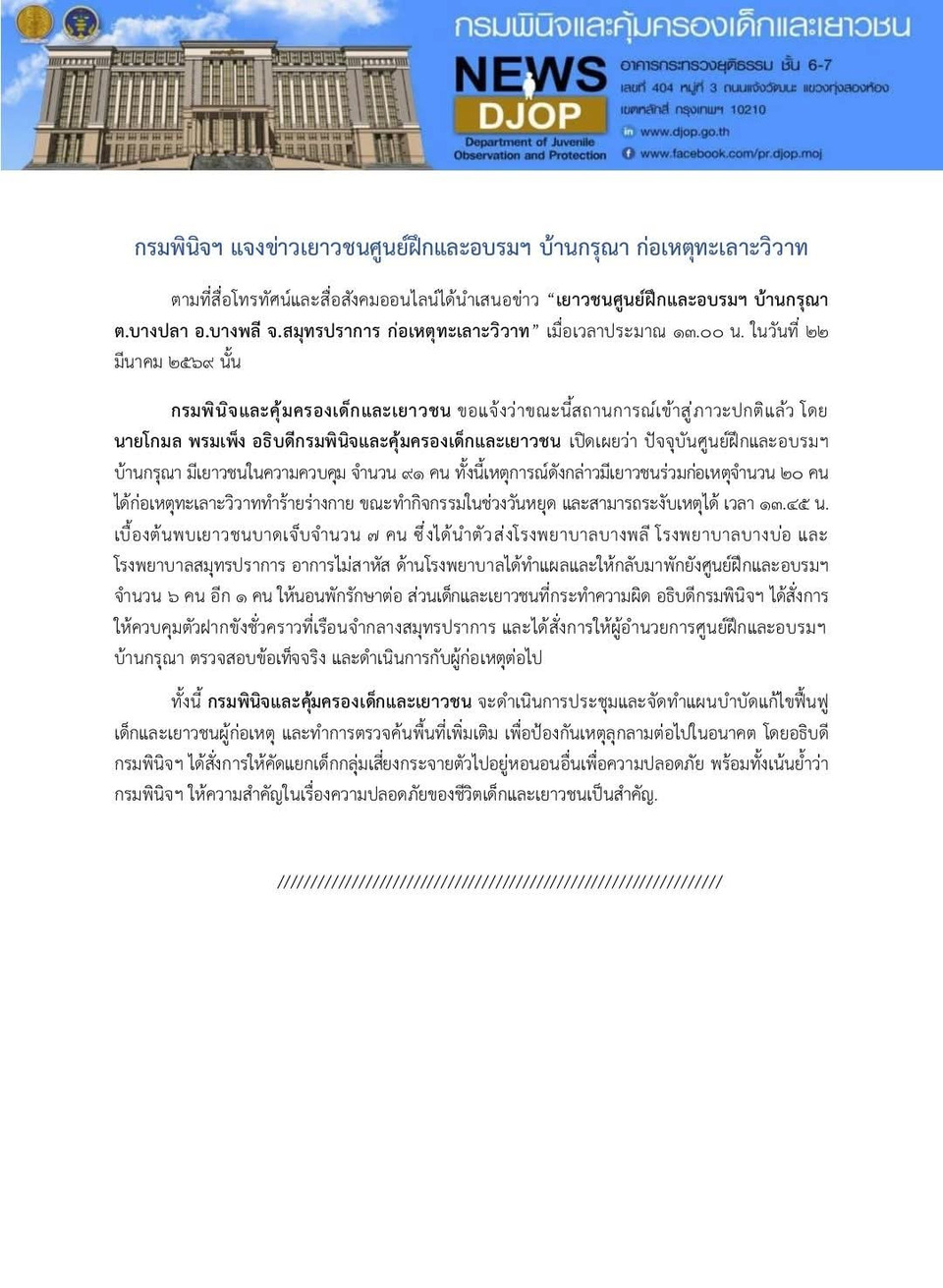 วันที่ 22 มี.ค.69 ตามที่สื่อโทรทัศน์และสื่อสังคมออนไลน์ได้นำเสนอข่าว “เยาวชนศูนย์ฝึกและอบรมฯ บ้านกรุณา ต.บางปลา อ.บางพลี จ.สมุทรปราการ ก่อเหตุทะเลาะวิวาท” เมื่อเวลาประมาณ 13.00 น. ในวันที่ 22 มีนาคม 2569 นั้น กรมพินิจและคุ้มครองเด็กและเยาวชน ขอแจ้งว่า ขณะนี้สถานการณ์เข้าสู่ภาวะปกติแล้ว โดย