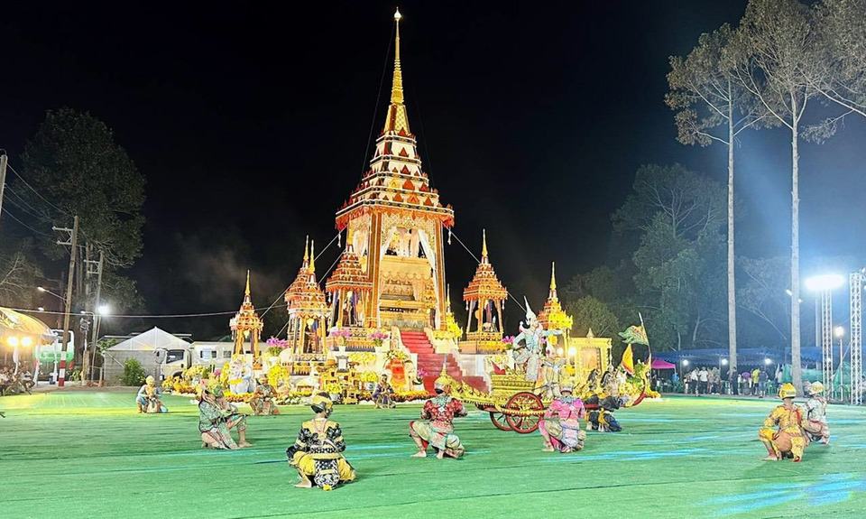 ในช่วงค่ำ ซึ่งเป็นพิธีถวายเพลิงสรีระสังขาร (เผาจริง) ภายในงานมีการแสดงโขนตอน “ยกรบ” โดยวิทยาลัยนาฏศิลปจันทบุรี รวมถึงการร่ายรำของชาวบ้านตำบลตาขันกว่า 100 คน เพื่อร่วมแสดงความอาลัยเป็นครั้งสุดท้าย เมื่อถึงช่วงเวลาสำคัญ ประชาชนที่เฝ้ารอจำนวนมากต่างพากันก้มกราบหน้าเมรุ ด้วยความอาลัยและเปี่ยมด้วยศรัทธา