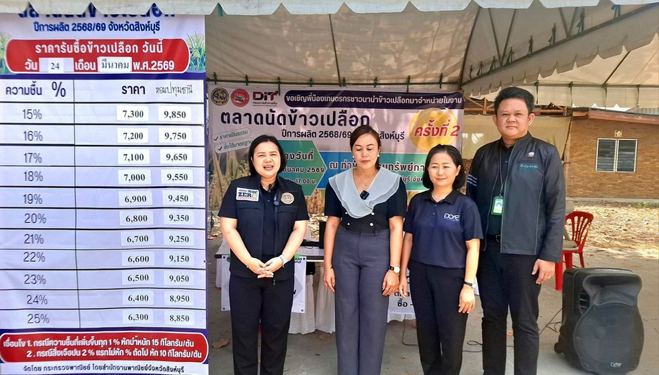 วันที่ 24 มี.ค.69 เวลา 11.00 น. นางอัจนา ปาลบุตร พาณิชย์จังหวัดสิงห์บุรี เป็นประธานในพิธีเปิด “งานตลาดนัดข้าวเปลือก ปีการผลิต 2568/69 จังหวัดสิงห์บุรี ครั้งที่ 2” ซึ่งจัดขึ้นระหว่างวันที่ 23 – 27 มีนาคม 2569 ณ ท่าข้าวอุดมทรัพย์การเกษตร ตำบลห้วยชัน อำเภออินทร์บุรี จังหวัดสิงห์บุรี