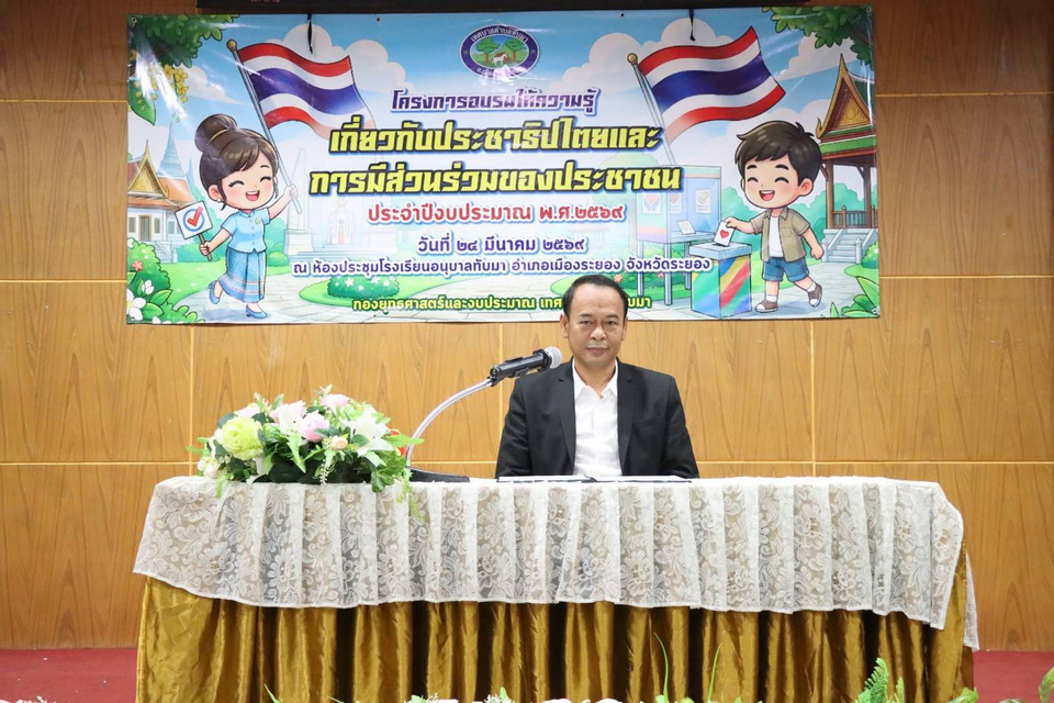 เมื่อเวลา 09.00 น. วันที่ 24 มี.ค.69 ที่ห้องประชุมโรงเรียนอนุบาลทับมา ต.ทับมา อ.เมือง จ.ระยอง นายสุทิน แก้วประถม นายกเทศมนตรีตำบลทับมา เป็นประธานในพิธีเปิดโครงการให้ความรู้เกี่ยวกับประชาธิปไตยและการมีส่วนร่วมของประชาชน ประจำปีงบประมาณ 2569 โดยมีสิบเอกวัลลภ ปรักแก้ว รองปลัดเทศบาลตำบลทับมา กล่าวรายงานวัตถุประสงค์ของการจัดโครงการฯ มีคณะผู้บริหาร สมาชิกสภาเทศบาล พนักงานเทศบาล พนักงานจ้าง ตลอดจนประชาชนในพื้นที่ตำบลทับมา จำนวน 70 คน เข้าร่วมโครงการฯ โดยมีการบรรยายให้ความรู้ในหลักสูตร “พลเมืองคุณภาพ” ครอบคลุมเนื้อหาเกี่ยวกับบริบทการเมืองไทยกับการเลือกตั้ง หลักการมีส่วนร่วมตามวิถีประชาธิปไตย ตลอดจนสิทธิ เสรีภาพ และหน้าที่ของปวงชนชาวไทย โดยทีมวิทยากรจากสำนักงานคณะกรรมการการเลือกตั้งประจำจังหวัดระยอง