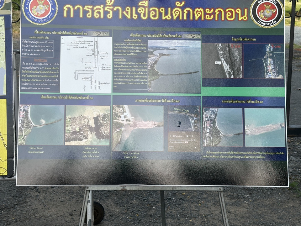 เมื่อวันที่ 25 มี.ค.69 พลเรือตรี พันณรงค์ ยุทธวงศ์ เลขานุการกองทัพเรือ นำสื่อมวลชนลงพื้นที่ชายแดนไทย-กัมพูชา บริเวณอำเภอคลองใหญ่ จังหวัดตราด โดยนาวาโท คุณวุฒิ รุ่งรัศมี ผู้บังคับหน่วยเฉพาะกิจ นาวิกโยธิน 182 ที่ดูแลจุดผ่านแดนบ้านหาดเล็ก อำเภอคลองใหญ่จังหวัดตราด สรุปสถานการณ์ชายแดนล่าสุดว่า หลังเหตุการณ์ปะทะ เมื่อวันที่ 20 ธันวาคม 2568 เอกชนในฝั่งกัมพูชา บริเวณพื้นที่เกาะกงได้ดำเนินการขุดรื้อเขื่อนดักตะกอนที่ล้ำเข้าไปในทะเล แต่ดำเนินการ ใช้รถแบคโฮขุดไปเพียง 127 เมตร แต่กรมอุทกศาสตร์ทหารเรือได้ให้ข้อมูลว่า หากจะทำให้เกิดการเปลี่ยนแปลงระบบนิเวศตามความเหมาะสม ต้องขุดลึกลงไปจากแนวสันเขื่อนเดิมประมาณ 3 เมตร ซึ่งจนถึงขณะนี้ทางฝ่ายกัมพูชา ยังไม่ได้ดำเนินการขุดลึกลงไปจนถึงฐานรากเพิ่มเติมแต่อย่างใด ทำให้สภาพพื้นที่ปัจจุบันไม่มีการเปลี่ยนแปลงแบบที่ควรจะเป็น และปัญหายังคงอยู่เหมือนเดิม จึงต้องรอจนกว่าจะมีการเจรจาร่วมกันอีกครั้ง หน่วยเฉพาะกิจนาวิกโยธิน 182 กองทัพเรือ รายงานสถานการณ์ชายแดนไทย- กัมพูชา ในพื้นที่บ้านหาดเล็ก จ.ตราด ใกล้พื้นที่หลักเขตที่ 73 หลักเขตสุดท้ายก่อนลงสู่ทะเล โดยพบว่าเขื่อนดักตะกอนที่ภาคเอกชนกัมพูชาเจ้าของรีสอร์ท ได้รื้อทำลายไปเพียง 127 เมตร และรื้อไปเฉพาะด้านบนส่วนฐานด้านล่างซึ่งเป็นหินยังไม่ได้มีการรื้อทำลายส่งผลให้ดินตะกอนไม่สามารถคัดเข้าสู่ชายหาดฝั่งไทยได้ เนื่องจากจะต้องมีระดับน้ำทะเลสูงมากกว่า 2.6 เมตร จึงจะท่วมสูงกว่าฐานราก ดังนั้นจึงทำให้ชายหาดฝั่งไทย เว้าหายเป็นพื้นที่กว่า 3,000 ตารางเมตร ขณะที่ฝั่งกัมพูชา มีชายหาด มีแผ่นดินเพิ่มขึ้นกว่า 30,000 ตารางเมตร