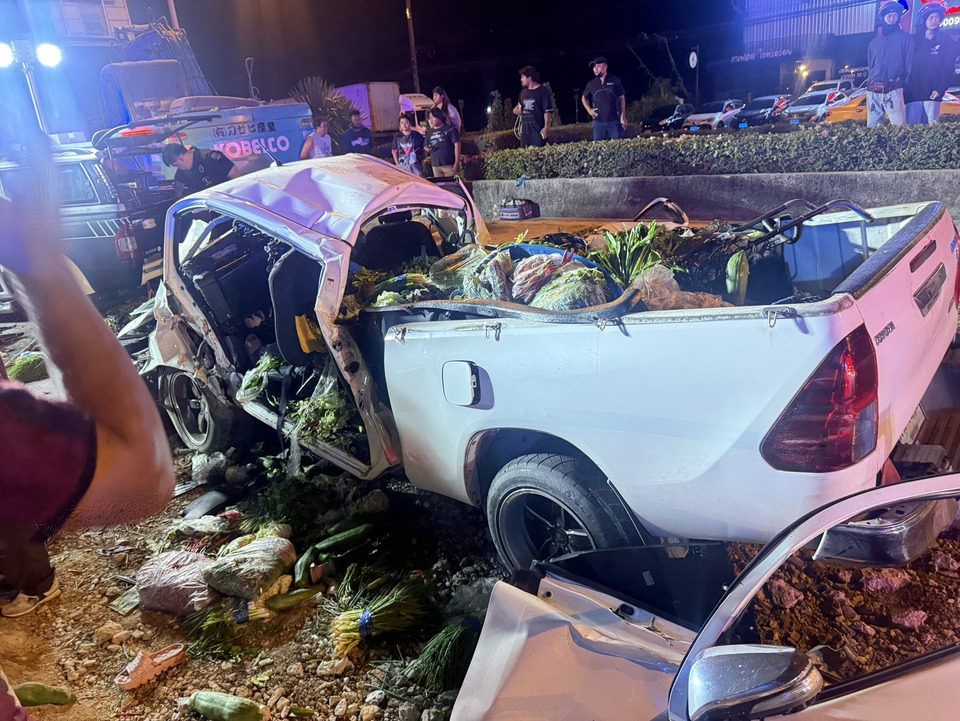 สลด พ่อค้าผักขับกระบะบรรทุกผักจะไปขายตลาด เสียหลักตกร่องถนนที่แขวงการทางขุดผิวถนนซ่อมสร้าง รถพังยับเสียชีวิตติดคารถทั้ง 3 ราย กู้ภัยต้องใช้เครื่องตัดถ่างงัดรถนำร่างออกมา