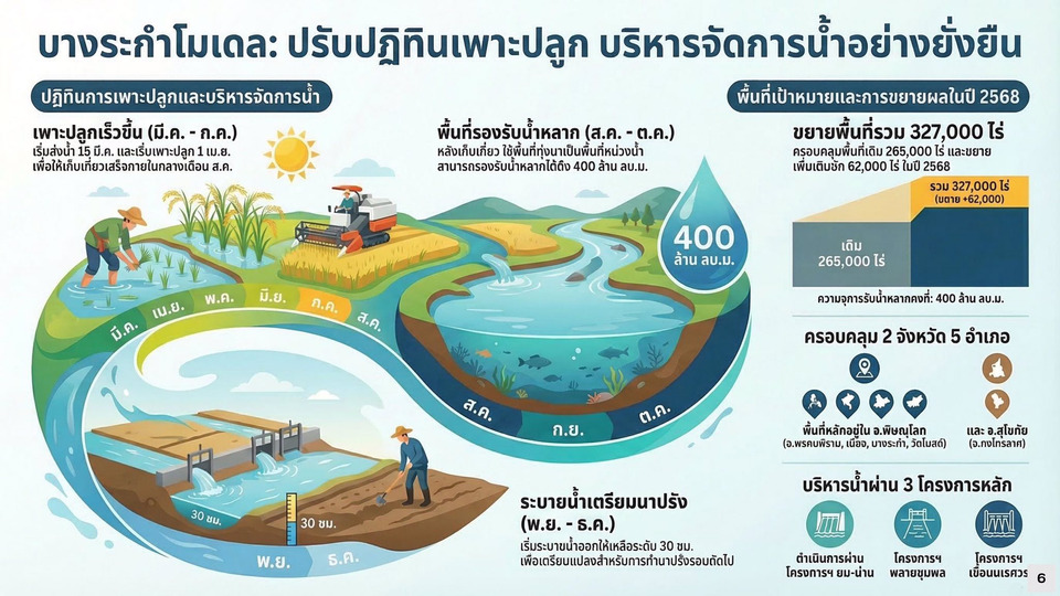 ในรอบปี 2568 โครงการบางระกำโมเดลดำเนินงานต่อเนื่องเป็นปีที่ 9 โดยมีการขยายพื้นที่โครงการจาก 265,000 ไร่ เป็น 327,000 ไร่ และ จัดสรรน้ำสนับสนุนการเพาะปลูกรวม 390 ล้าน ลบ.ม. เพื่อให้เกษตรกรในพื้นที่ลุ่มต่ำสามารถเก็บเกี่ยวผลผลิตได้ก่อนฤดูน้ำหลากตามธรรมชาติในช่วงกลางเดือนสิงหาคม ซึ่งเป็นไปตามปฏิทินการเพาะปลูกเพื่อลดความเสี่ยงความเสียหายของผลผลิตข้าวในพื้นที่