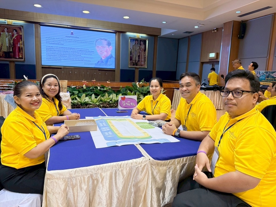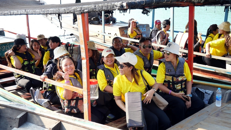 ในกิจกรรมครั้งนี้ คณะผู้เข้าร่วมโครงการยังได้เรียนรู้จากภูมิทัศน์ธรรมชาติของพื้นที่จริง โดยล่องเรือในอ่างเก็บน้ำของ เขื่อนรัชชประภา เพื่อศึกษาความสัมพันธ์ระหว่างภูมิประเทศ ป่าไม้ และแหล่งน้ำ ซึ่งเป็นองค์ประกอบสำคัญของระบบนิเวศตามแนวคิดการพัฒนาที่สมดุลตามศาสตร์พระราชา ระหว่างเส้นทาง คณะได้เยี่ยมชมจุดสำคัญของพื้นที่อย่าง เขาสามเกลอ หรือ “กุ้ยหลินเมืองไทย” ภูเขาหินปูนสามยอดที่ตั้งตระหง่านกลางผืนน้ำสีเขียวมรกต ตลอดจนการสังเกตความอุดมสมบูรณ์ของระบบนิเวศน้ำจืดบริเวณแพนางไพร ซึ่งเป็นแหล่งอาศัยของฝูงปลาตะเพียนหางแดงจำนวนมาก กิจกรรมเหล่านี้ไม่เพียงเปิดโอกาสให้ผู้เข้าร่วมได้สัมผัสความงดงามของธรรมชาติ แต่ยังทำให้เห็นภาพการพัฒนาที่ต้องอาศัยความเข้าใจต่อระบบธรรมชาติอย่างรอบด้าน ซึ่งเป็นหัวใจสำคัญของศาสตร์พระราชาในการบริหารจัดการทรัพยากรให้เกิดความสมดุลและยั่งยืน