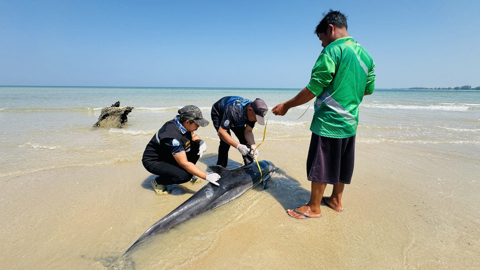 เจ้าหน้าที่ทรัพยากรทางทะเลและชายฝั่งเร่งตรวจสอบ หลังได้รับแจ้งพบโลมาเกยตื้นเสียชีวิตบริเวณชายหาดบางสัก อำเภอตะกั่วป่า จังหวัดพังงา