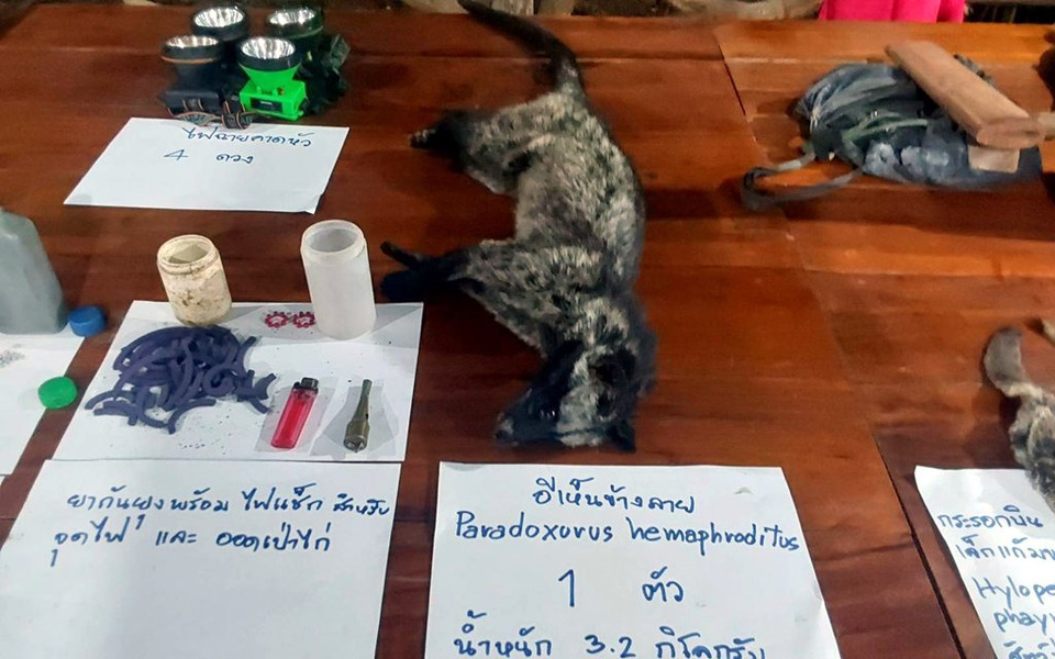 เมื่อวันที่ 29 มี.ค.69 เวลาประมาณ 23.20 น. เจ้าหน้าที่เขตรักษาพันธุ์สัตว์ป่าแม่ตื่น ได้ทำการออกตรวจปราบปรามการกระทำผิดกฎหมายว่าด้วยการป่าไม้ ในพื้นที่รับผิดชอบ คณะเจ้าหน้าที่เขตรักษาพันธุ์สัตว์ป่าแม่ตื่น ร่วมกับเจ้าหน้าที่สายตรวจปราบปราม สายที่ 1 เจ้าหน้าที่ร้อยตำรวจตระเวฯชายแดน 345 เจ้าหน้าที่ตำรวจภูธร สภ.แม่ระมาด และเจ้าหน้าที่สถานีควบคุมไฟป่าแม่ตื่น ได้ร่วมกันตรวจยึดจับกุม ผู้กระทำความผิดการล่าสัตว์ป่า ผู้ต้องหา 2 ราย พร้อมด้วยของกลาง ได้แก่ 1.ซากอีเห็นข้างลาย จำนวน 1 ตัว น้ำหนัก 3.2 กิโลกรัม 2.ซากกระรอกบินเล็กแก้มขาว จำนวน 2 ตัว น้ำหนักรวม 400 กรัม 3.รถยนต์ จำนวน 1 คัน 4.อาวุธปืนไทยประดิษฐ์ ขนาด.22 LR พร้อมกล้องเล็ง จำนวน 1 กระบอก 5.กระสุนปืน ขนาด.22 LR จำนวน 15 นัด 6.ปลอกกระสุนปืน ขนาด.22 LR จำนวน 1 ปลอก 7.อาวุธปืนไทยประดิษฐ์ (ปืนแก๊ป) จำนวน 1 กระบอก พร้อมอุปกรณ์ประกอบด้วย ดินปืน 1 ขวด ,ลูกตะกั่ว 1 ถุง ,แก๊ป ,ฝอย ,ออดเป่าเรียกสัตว์ 1 อัน 8.ไฟฉายคาดหัว จำนวน 4 ดวง 9.ยากันยุงหักเป็นแท่งใส่ในกระป๋องพร้อมไฟแช็ก
