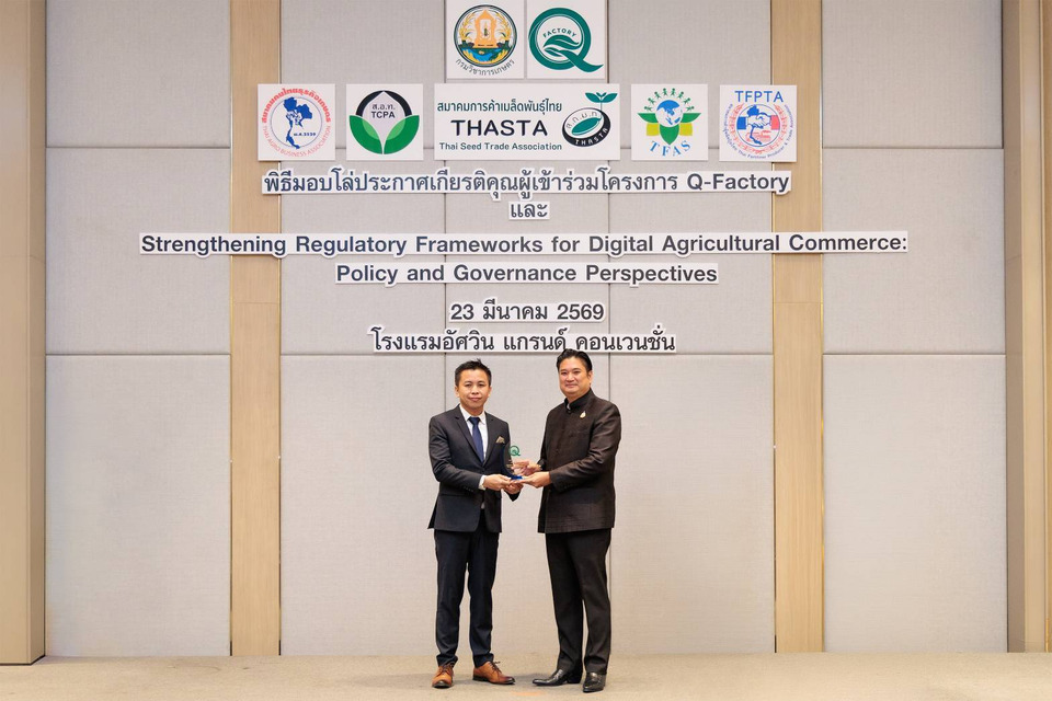 นายรพีภัทร์ จันทรศรีวงศ์ อธิบดีกรมวิชาการเกษตร มอบโล่ประกาศเกียรติคุณและใบรับรองผ่านการประเมินมาตรฐานโครงการ (Q Factory) ให้กับ นายทินกร ศรีวิชัย ผู้จัดการอาวุโส ศูนย์การผลิตเมล็ดพันธุ์ข้าวโพดลูกผสม จังหวัดพิษณุโลก และ นายพงษ์พนธ์ เพิ่มทรัพย์ ผู้จัดการอาวุโส ศูนย์การผลิตเมล็ดพันธุ์ผัก จังหวัดขอนแก่น