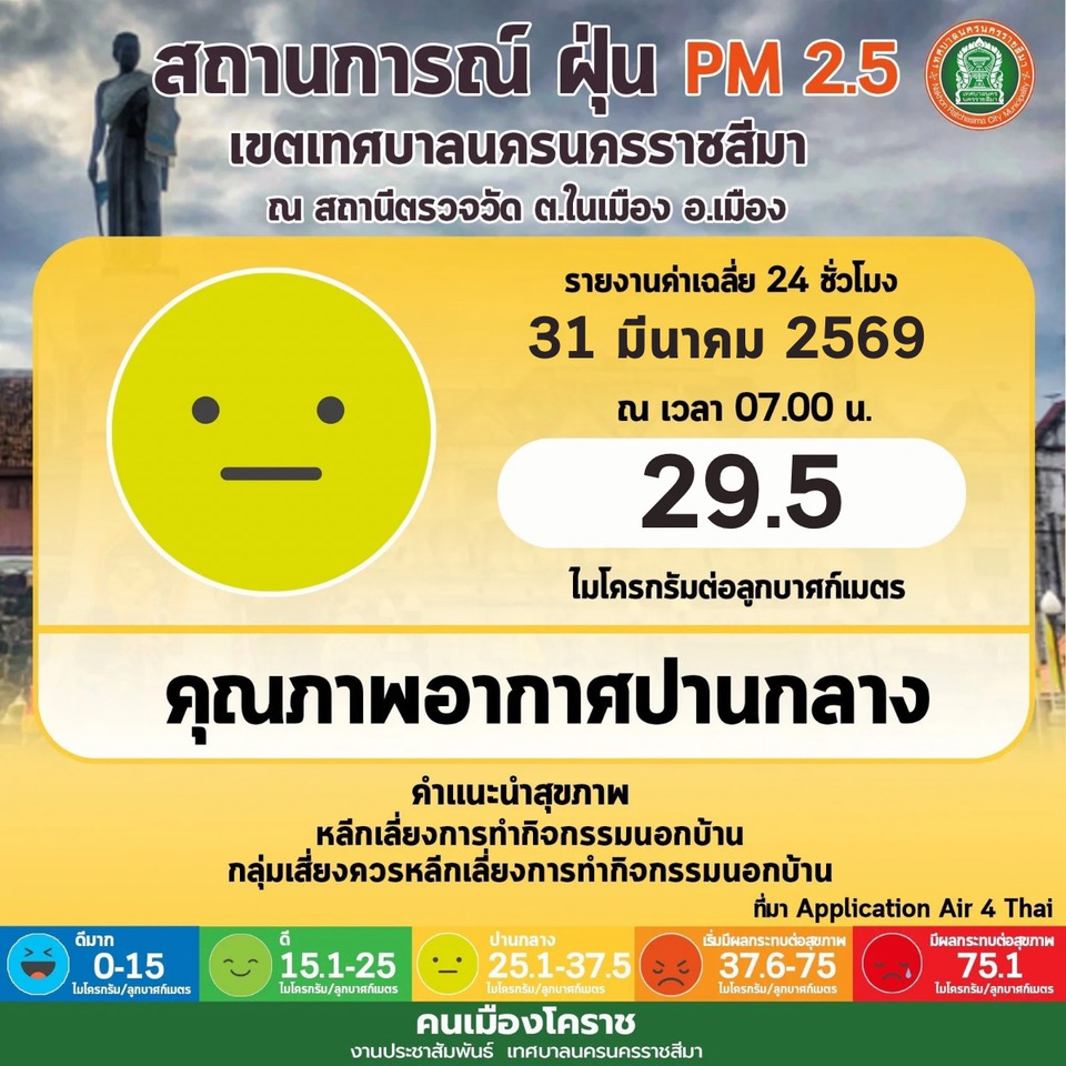 วันที่ 31 มีนาคม 2569 รายงานสภาพอากาศในพื้นที่ 32 อำเภอ จ.นครราชสีมา มีค่าฝุ่น PM2.5 สูงขึ้นอีกครั้งหลังมีพายุฤดูร้อนเคลื่อนผ่านทำให้จุดความร้อนดับหมด ภาพรวมมีค่าเกินมาตรฐาน สาเหตุหลักมาจากการเผาในที่โล่ วัดอุณหภูมิเฉลี่ย 37 องศาเซลเซียส ทำให้อากาศร้อนอบอ้าวและตรวจสอบข้อมูลจุด hotspot ที่จับความร้อนได้ช่วงบ่ายที่ผ่านมา พบจุดความร้อน 22 จุด ในเขต 32 อำเภอ ดังนี้ ต.พุดซา อ.เมือง 1 จุด ต.ด่านขุนทด อ.ด่านขุนทด 6 จุด ต.พันชนะ อ.ด่านขุนทด 2 จุด ต.หนองบัวตะเกียด 1 จุด ต.ดอนตะหนิน อ.บัวใหญ่ 2 จุด ต.บัลลังก์ อ.โนนไทย 2 จุด ต.บุงอ้อ อ.ขามทะเลสอ 3 จุด ต.หนองสาหร่าย อ.ปากช่อง 2 จุด ต.วังไทร อ.ปากช่อง 2 จุด และ ต.มะเกลือใหม่ อ.สูงเนิน 1 จุด บางจุดอยู่ระหว่างควบคุมเพลิงให้อยู่ในวงจำกัด