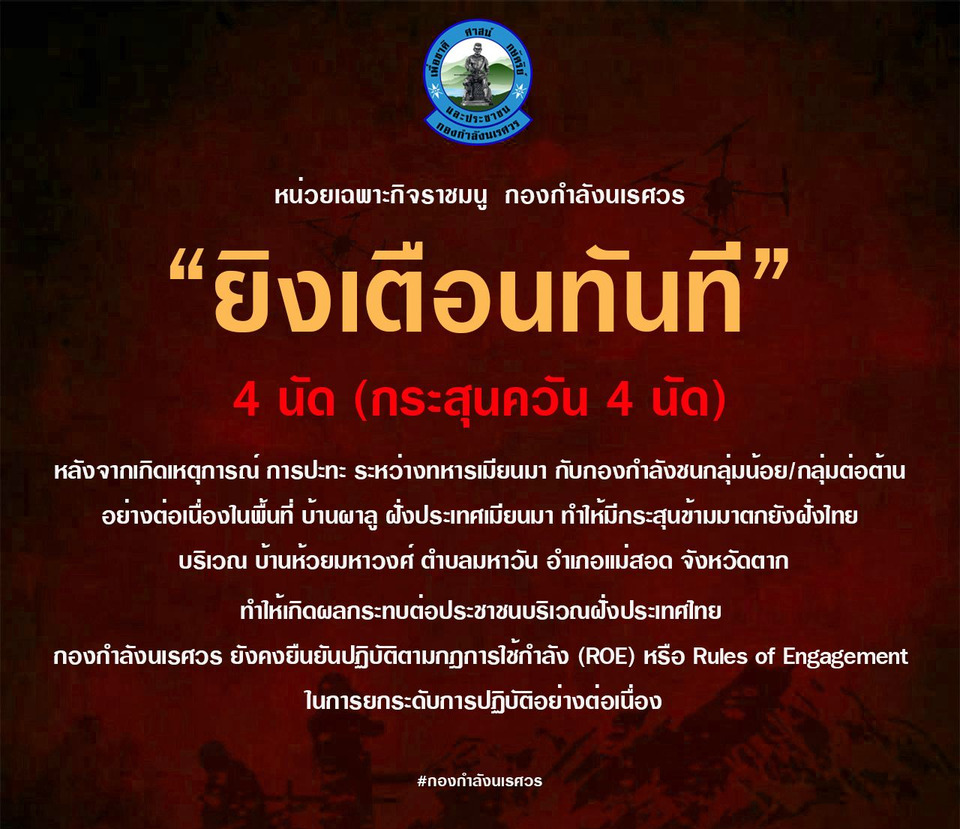 ทั้งนี้ กองกำลังนเรศวรยืนยันว่า ยังคงปฏิบัติตามกฎการใช้กำลัง (Rules of Engagement: ROE) อย่างเคร่งครัด พร้อมติดตามสถานการณ์อย่างใกล้ชิด