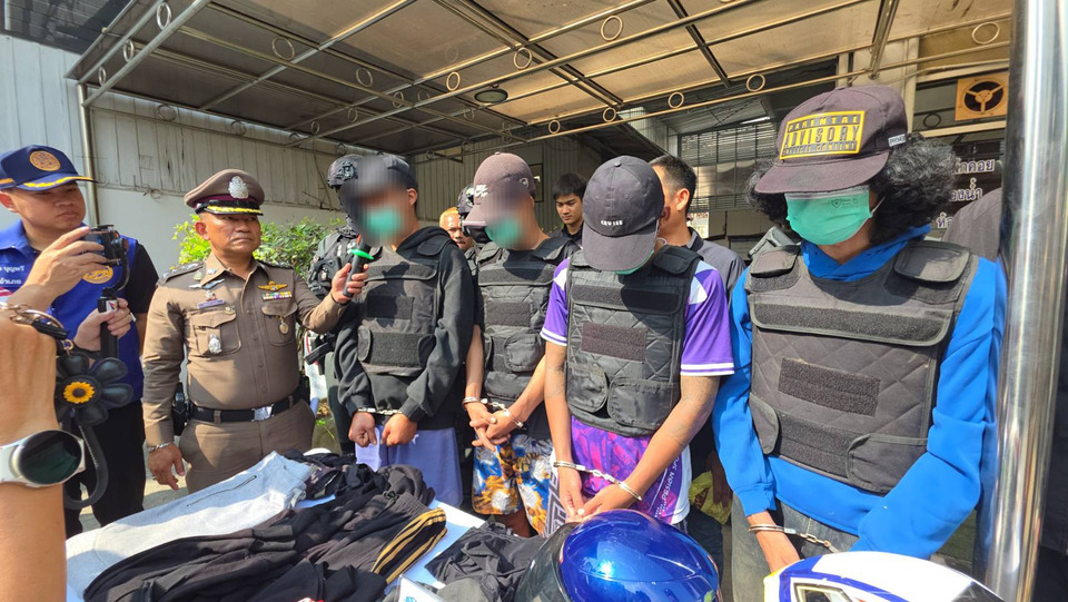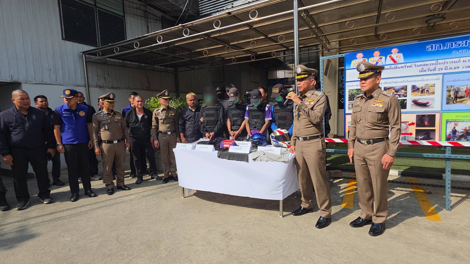 วันที่ 31 มีนาคม 2569 ที่สถานีตำรวจภูธรกระทุ่มแบน จ.สมุทรสาคร พล.ต.ท.พิสิฐ ตันประเสริฐ ผบช.ภ.7 พร้อมด้วย พล.ต.ต.ชมชวิณ ปุระธนานนท์ รอง ผบช.ภ.7,พล.ต.ต.ธีระเดชอธิภัคกุล ผบก.ภ.จว.สมุทรสาคร,พล.ต.ต.กานต์ ธรรมเกษม ผบก.สส.ภ.7,พงษ์ศิริ เก่งนอก รอง ผบก.กค.ภ.7 ปฏิบัติราชการรอง ผบก.สส.ภ.7,พ.ต.อ.พศพงศ์ มณฑา ผกก.สภ.กระทุ่มแบน,พ.ต.อ.สุรศักดิ์ สิทธิโชคธรรม ผกก.สส.ภ.จว.สมุทรสาคร,พ.ต.ท.อชิรเวชชย์ สุพรรณเภสัช รอง ผกก.สส.ฯ,พ.ต.ท.ชุมพรฉัตร์สงวนชัย รอง ผกก.ป.ฯ,พ.ต.ท.สุเชาว์ เหมือนมิ่ง,พ.ต.ต.พงษ์พัฒน์ ทองเกิดหลวง สว.สส.ฯ พร้อมเจ้าหน้าที่ชุดสืบสวน ฯ ภาค7 สืบสวนภูธรจังหวัดสมุทรสาคร และสืบสวน สภ.กระทุ่มแบน ได้ร่วมกันแถลงข่าวการจับกุม 4 ผู้ต้องหา ที่ร่วมกันก่อเหตุปล้นทรัพย์รถจักรยานยนต์(พนักงานรับส่งสินค้าผู้โดยสารของแอปพลิเคชัน Bolt (โบลท์) ประกอบด้วย นายอนุวัฒน์ (สงวนนามสกุล) อายุ 22 ปี หรือโจ้ หัวหน้าแก็งค์ มีพฤติกรรมการก่อเหตุทั้งวางแผนปล้น โทรศัพท์ลวงผู้เสียหายให้มารับในที่เกิดเหตุ และลงมือใช้มีดฟันผู้เสียหายเพื่อชิงทรัพย์ (รถ จยย.และทรัพย์ฯ) ,นายพิษณุ (สงวนนามสกุล) อายุ 22 ปี ,นายทรัพย์ทวี (สงวนนามสกุล) อายุ 22 ปี และ นายณัฐดนัย (สงวนนามสกุล) อายุ 22 ปี โดยมีของกลางเป็นรถ จยย.ยี่ห้อ HONDA รุ่น เวฟไอ สีเทา-ดำ หมายเลขทะเบียน 9ขษ-9294 กรุงเทพ ฯที่ใช้ในการก่อเหตุ,หมวกกันน๊อค จำนวน 2 ใบที่ใส่มาก่อเหตุ,เสื้อผ้าที่สวมใส่ในวันก่อเหตุ,รองเท้าที่สวมใส่ในวันก่อเหตุ จำนวน 3 คู่,กระเป๋าสะพายของผู้เสียหาย ส่วนมีดสปาร์ต้า ที่นายโจ้ใช้ฟันผู้เสียหายนั้น ผู้ต้องหาอ้างโยนทิ้งในคลองแถวๆ เขตหนองแขม ในช่วงที่กำลังขับรถหลบหนี ซึ่งทางเจ้าหน้าที่ชุดจับกุมหลังจากที่นำตัวผู้ต้องหาไปทำแผนประกอบคำรับสารภาพแล้ว ก็จะให้ผู้ต้องหานำไปงมค้นหาอาวุธมีด ของกลางอีก 1 รายการด้วย