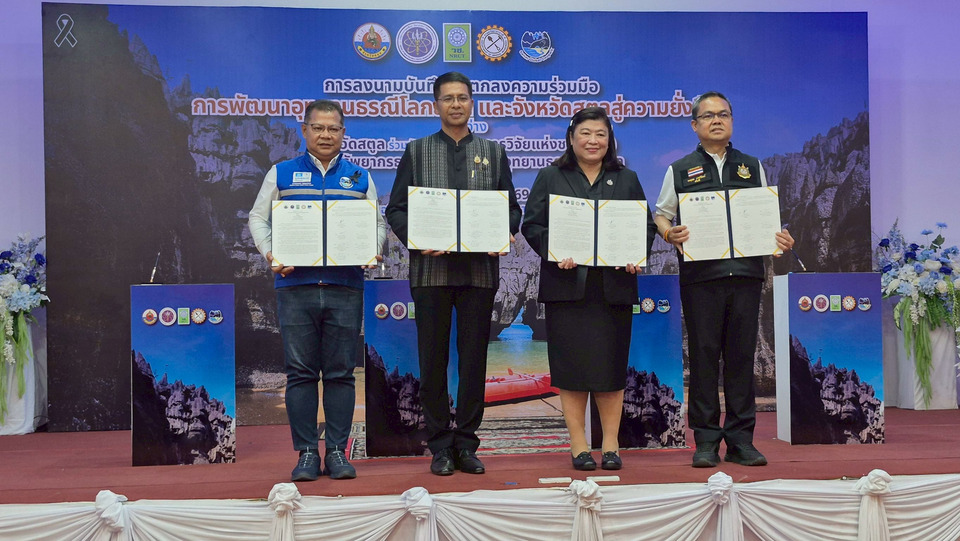 นอกจากนี้ยังมีผลิตภัณฑ์ "พริกไทยสุไหงอุเป" สินค้า GI ชื่อดัง และผลิตภัณฑ์จากอีกหลากหลายชุมชนที่ตบเท้าเข้ามาโชว์ศักยภาพในงานครั้งนี้ สะท้อนให้เห็นว่า "ยิ่งอนุรักษ์ ยิ่งสร้างรายได้" คือหัวใจสำคัญของชาวสตูล ยุทธศาสตร์ 4 ภาคี: ปิดจุดอ่อน "ใบเหลือง" มุ่งสู่ต้นแบบโลก เพื่อรักษาความยั่งยืนของภูมิปัญญาเหล่านี้ เมื่อวันที่ 2 เมษายน 2569 ณ ศาลากลางจังหวัดสตูล จึงเกิดก้าวย่างสำคัญในพิธีลงนามบันทึกข้อตกลง (MOU) "การพัฒนาอุทยานธรณีโลกสตูล และจังหวัดสตูลสู่ความยั่งยืน" ระหว่าง จังหวัดสตูล, วช., กรมทรัพยากรธรณี และสำนักงานอุทยานธรณีโลกสตูล