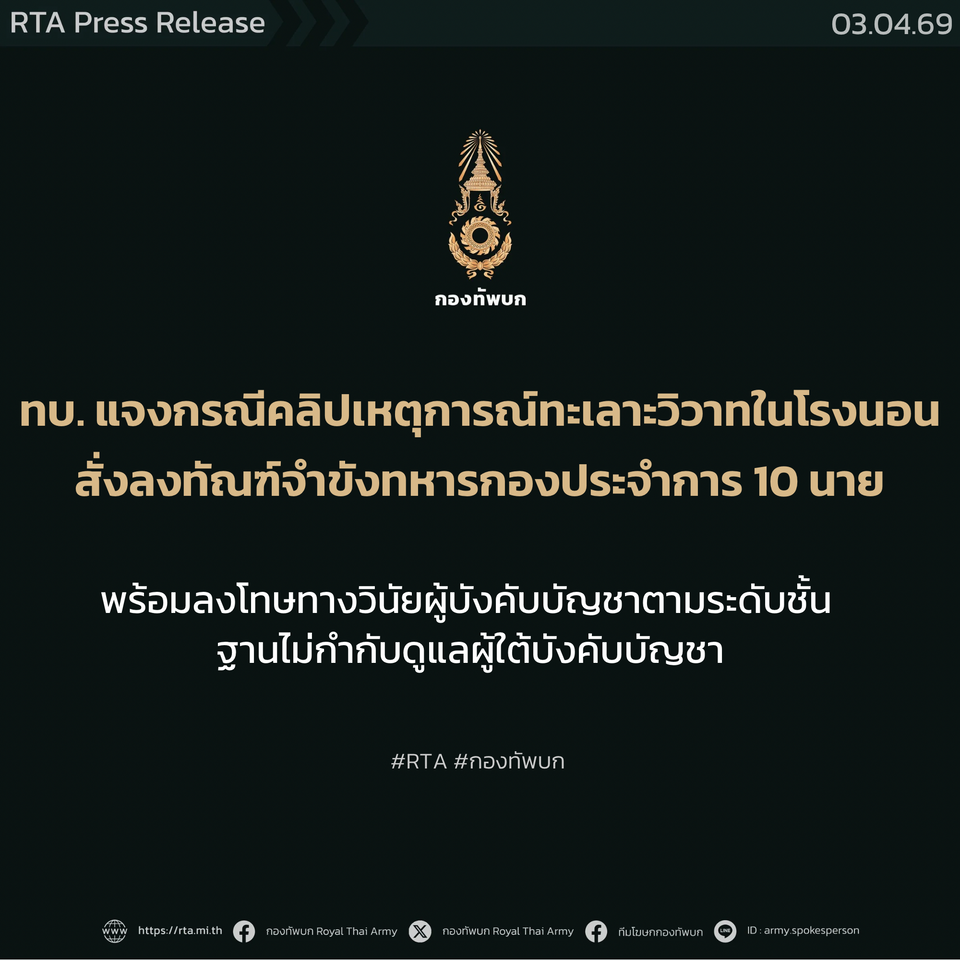 จากกรณีที่มีการเผยแพร่คลิปวิดีโอเหตุการณ์ทะเลาะวิวาทของทหารภายในอาคารโรงนอนผ่านสื่อสังคมออนไลน์นั้น กองทัพบกได้ตรวจสอบข้อมูลพบว่า เหตุการณ์ดังกล่าวเกิดขึ้นเมื่อวันที่ 27 มี.ค.69 ณ หน่วยทหารในสังกัดศูนย์การกำลังสำรอง ค่ายธนะรัชต์ จ.ประจวบคีรีขันธ์ โดยเป็นการทะเลาะวิวาทชกต่อยกันระหว่างทหารกองประจำการ ซึ่งมีสาเหตุมาจากปัญหาความขัดแย้งส่วนตัว