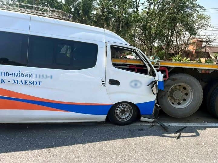 เกิดอุบัติเหตุรถตู้โดยสารตาก-แม่สอดชนรถบรรทุกเทรลเลอร์ จ.ตาก เสียชีวิต 5 ราย บาดเจ็บ 9 ราย เจ้าหน้าที่เร่งช่วยเหลือและสอบสวนหาสาเหตุ