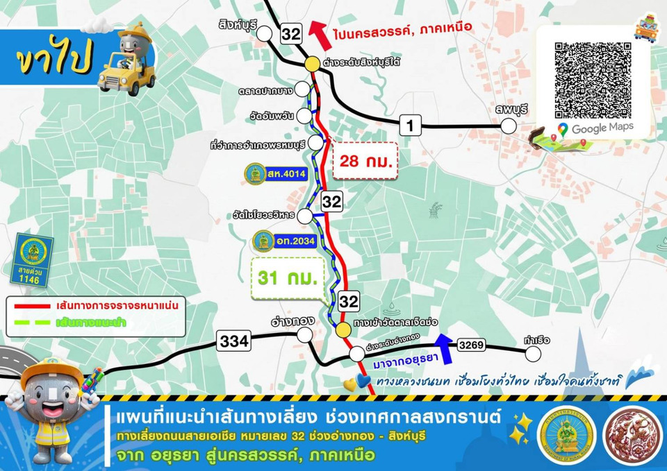 แขวงทางหลวงชนบทอ่างทองยังได้จัดเตรียมเจ้าหน้าที่และป้ายแนะนำเส้นทางตลอดสาย เพื่อให้ประชาชนเดินทางได้อย่างมั่นใจ ผู้เดินทางสามารถสแกน QR Code บนภาพเพื่อลิงก์เข้ากับ Google Maps ได้ทันที