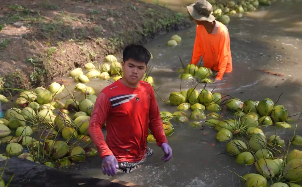 “เมื่อมะพร้าวได้อายุการเก็บเกี่ยว ที่สวนของเราจะใช้วิธีปล่อยมะพร้าวลงน้ำ เพื่อลดแรงกระแทก จากนั้นคัดแยกตามคุณภาพ ก่อนลำเลียงเข้าสู่กระบวนการแปรรูป ซึ่งต้องดำเนินการอย่างรวดเร็ว เพื่อรักษาความสดใหม่ให้ได้มากที่สุด แล้วรีบส่งต่อเข้าโรงงานผลิตที่ตั้งอยู่ไม่ไกลสวน แปรรูปด้วยเทคโนโลยีแช่แข็งแบบเร่งด่วน (Shock Freeze) ที่อุณหภูมิ -28 องศาเซลเซียส ก่อนจัดเก็บที่ -18 องศา เพื่อคงรสชาติ ความหอม และคุณภาพแบบสดจากสวน ซึ่งนอกจากจะช่วยยืดอายุสินค้าแล้ว ยังตอบโจทย์ผู้ประกอบการธุรกิจอาหาร โรงแรม และร้านอาหาร ที่ต้องการความสะดวก ลดขั้นตอนการเตรียมวัตถุดิบ และควบคุมต้นทุนได้อย่างมีประสิทธิภาพ”