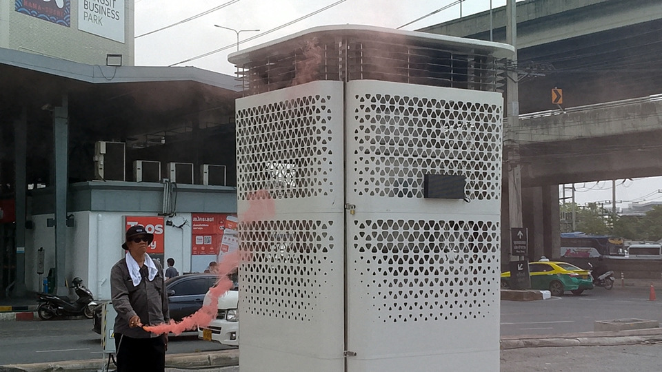 ซึ้งการทดสอบได้ใช้ "พลุแฟร์" ซึ่งในวันนี้ได้มีการสาธิต จุดโดยการจำลองสร้างกลุ่มควันเปรียบเป็นสถานการณ์ฝุ่นหนาแน่น ซึ่งตัวเครื่องสามารถดูดซับควันทั้งหมดเข้าสู่ระบบกรอง พร้อมแสดงค่า PM 2.5 ที่ลดลงอย่างรวดเร็ว บนจอ LED ที่ติดตั้งอยู่ที่ตัวเครื่อง ก่อนจะปล่อยอากาศที่ฟอกสะอาดบริสุทธิ์ออกมาทางด้านบนของเครื่อง