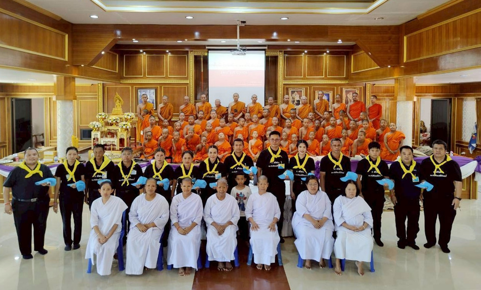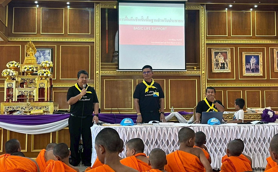 จิตอาสาพระราชทาน 904 จังหวัดสุราษฎร์ธานี ถ่ายทอดความรู้การช่วยชีวิตขั้นพื้นฐาน CPR และการใช้ AED ให้สามเณรภาคฤดูร้อน 200 รูป ณ วัดเขากอม ส่งเสริมคุณธรรมและจิตสาธารณะในช่วงปิดภาคเรียน