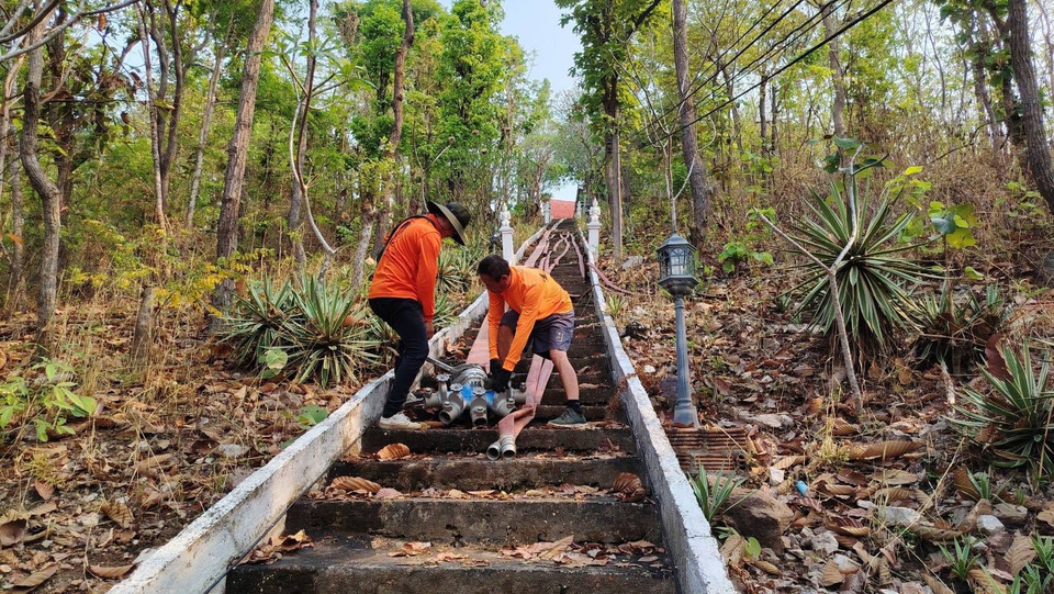 การสร้าง "แนวป้องกันไฟเปียก" ทีมปฏิบัติการหลักสูตรปภเขต 10 ลำปางและเขต 8 กำแพงเพชร ได้ติดตั้งเครื่องสูบส่งน้ำระยะไกลสูบสูบน้ำจากแหล่งน้ำ เดินเท้าลากสายส่งน้ำขึ้นบนดอยสูง ระยะทางสูงชัน ควบคู่กับการโรยสายดับเพลิงขนาด 2.5 นิ้ว ฉีดพ่นน้ำตามพื้นที่ป่าโดยรอบ เพื่อเพิ่มความชุ่มชื้นในพื้นที่เสี่ยง โดยเริ่มสูบน้ำตั้งแต่เวลา 09.00 – 21.00 น.