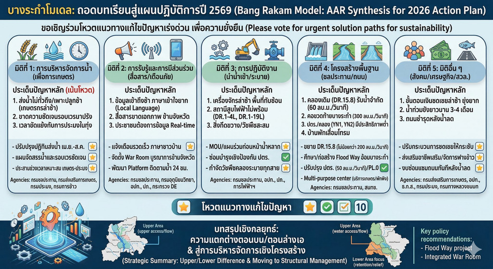 โดยทางสำนักงานชลประทานที่ 3 และส่วนราชการที่ร่วมบูรณาการ จะนำข้อมูลและข้อเสนอแนะทุกด้านทั้งในแง่ของจุดแข็งและข้อที่ควรพัฒนา มาใช้เป็นฐานข้อมูลสำคัญในการออกแบบแผนการทำงานปี 2569 เพื่อให้โครงการบางระกำโมเดลยังคงเป็นเครื่องมือในการปกป้องผลผลิตทางการเกษตรก่อนฤดูน้ำหลาก และสร้างความยั่งยืนให้กับคนในพื้นที่อย่างแท้จริง ผ่านการบูรณาการและการทำงานร่วมกันอย่างใกล้ชิดระหว่างภาครัฐและประชาชน