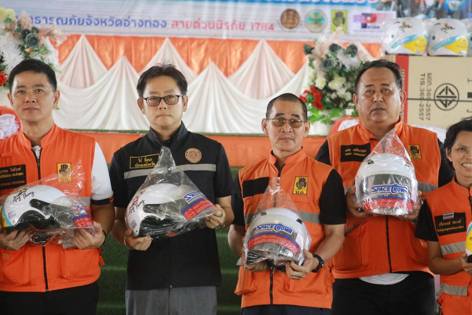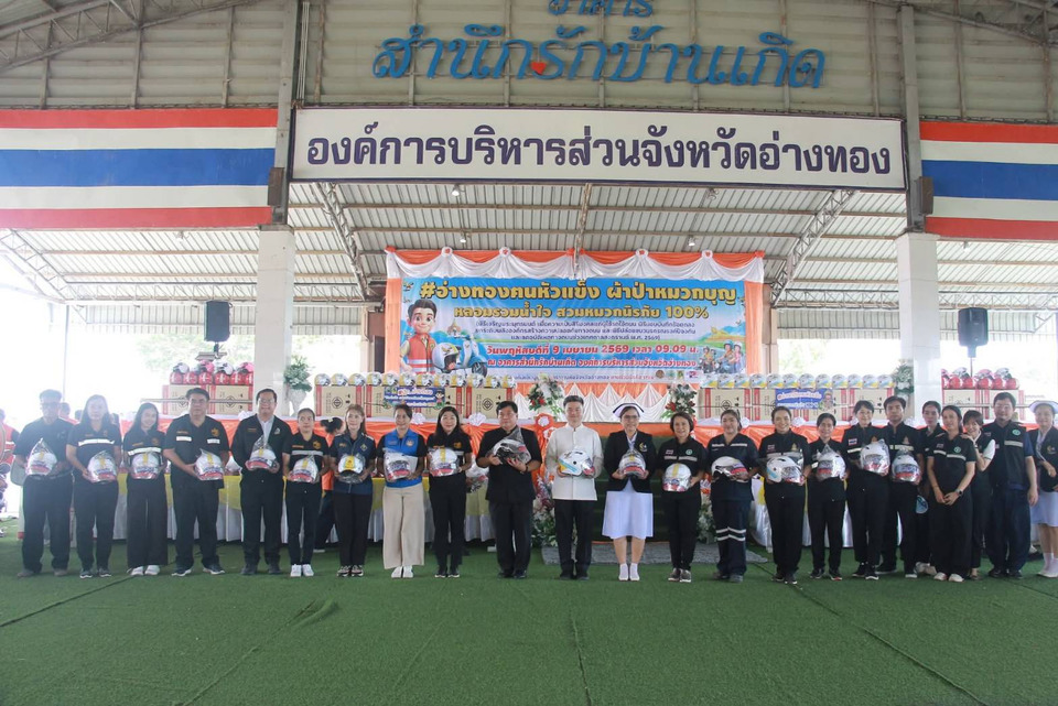 วันที่ 9 เม.ย.69 ณ อาคารสำนึกรักบ้านเกิด องค์การบริหารส่วนจังหวัดอ่างทอง อ.เมืองอ่างทอง จ.อ่างทอง สำนักงานป้องกันและบรรเทาสาธารณภัยจังหวัดอ่างทอง จัดโครงการอ่างทอง "ฅนหัวแข็ง" ผ้าป่าหมวกบุญ หลอมรวมน้ำใจ สวมหมวกนิรภัย 100% โดยมี นายสมศักดิ์ ปริศนานันทกุล อดีตรัฐมนตรีว่าการกระทรวงเกษตรและสหกรณ์ นายนที มนตริวัต ผู้ว่าราชการจังหวัดอ่างทอง นายไพบูลย์ ศุภบุญ รองผู้ว่าราชการจังหวัดอ่างทอง น.ส.สุกัญญา กุลสุวรรณ์ ปลัดจังหวัดอ่างทอง หัวหน้าสำนักงานป้องกันและบรรเทาสาธารณภัยจังหวัดอ่างทอง หัวหน้าส่วนราชการ นายอำเภอ นายประยูร ภู่แส รองกรรมการผู้จัดการบริษัท กลางคุ้มครองผู้ประสบภัยจากรถ จำกัด และภาคีเครือข่ายความปลอดภัยทางถนนจากทุกภาคส่วน ร่วมในพิธี