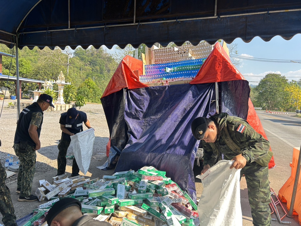 ต่อมาเวลา 15.00 น. ขณะที่เจ้าหน้าที่ตั้งจุดตรวจจุดสกัด บริเวณ จุดตรวจร่วมสามแยกทองผาภูมิ ม.1 ต.ท่าขนุน อ.ทองผาภูมิ จ.กาญจนบุรี เจ้าหน้าที่สังเกตพบรถยนต์กระบะ ยี่ห้อ Toyota Revo สีเทา หมายเลขทะเบียน ผก 911 กาญจนบุรี ลักษณะบรรทุกสิ่งของจำนวนมากด้านท้ายกระบะ จึงให้สัญญาณหยุดรถเพื่อทำการตรวจสอบ พบ นายจตุรงค์ (สงวนนามสกุล) อายุ 33 ปี สัญชาติไทย เป็นผู้ขับขี่ และนายแอด ไม่มีชื่อสกุล อายุ 37 ปี สัญชาติเมียนมา นั่งโดยสารมาด้วย จึงได้ทำการตรวจสอบอย่างละเอียด จึงพบของกลาง บุหรี่เลี่ยงภาษีรวมทั้งสิ้น จำนวน 6,590 คอตตอน ซุกซ่อนอยู่บริเวณด้านท้ายรถยนต์คันดังกล่าว โดยใช้ผ้าใบปิดบังการตรวจสอบจากเจ้าหน้าที่ รวมมูลค่าเปรียบเทียบปรับของสรรพสามิต เป็นเงินกว่า 59,310,000 บาท