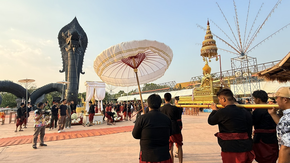 ภายในงานมีขบวนแห่อย่างยิ่งใหญ่ นำโดยกลุ่มชาติพันธุ์ “ญัฮกุร” ฟ้อนรำอย่างสวยงาม ตามด้วยขบวนบายศรี ก่อนอัญเชิญพระไชยเทพสถิต พระพุทธรูปทองคำ สูง 19 นิ้ว ให้ประชาชนร่วมสรงน้ำเพื่อความเป็นสิริมงคล ขณะเดียวกัน บริเวณจุดบวงสรวง “พญานิลกาฬนาคราช ปู่องค์ดำ” เต็มไปด้วยผู้ศรัทธาที่นำดอกไม้ธูปเทียนมาสักการะ พร้อมจุดธูปเสี่ยงทายขอเลขเด็ด เพื่อนำไปเสี่ยงโชค ท่ามกลางแผงจำหน่ายสลากกินแบ่งรัฐบาลจำนวนมากภายในพื้นที่ โดยมีรายงานว่า นักเสี่ยงโชคบางส่วนมองเห็นตัวเลข เช่น 478 และ 472 สร้างสีสันและความคึกคักให้กับงานอย่างมาก
