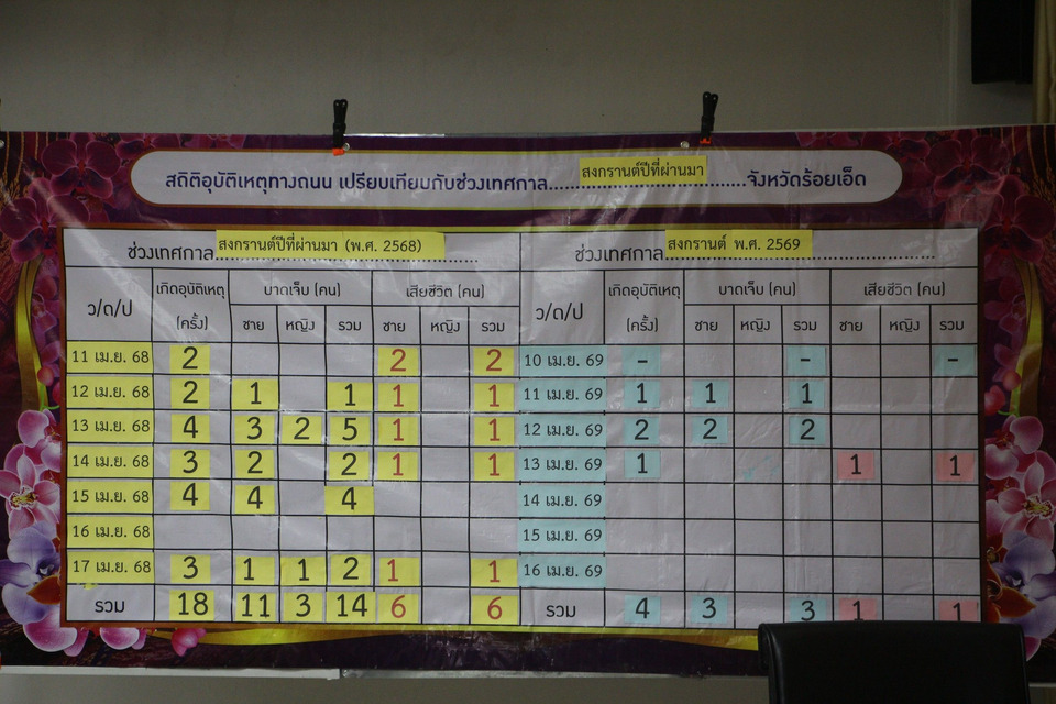 ผลการดำเนินงานในรอบ 24 ชั่วโมงของวันที่ 13 เมษายน 2569 พบว่า เกิดอุบัติเหตุ 1 ครั้ง ในพื้นที่อำเภอเมืองร้อยเอ็ด ไม่มีผู้บาดเจ็บ และมีผู้เสียชีวิต 1 ราย ทั้งนี้ เจ้าหน้าที่ได้เร่งให้ความช่วยเหลือและติดตามสถานการณ์อย่างใกล้ชิด เพื่อป้องกันไม่ให้เกิดเหตุซ้ำ