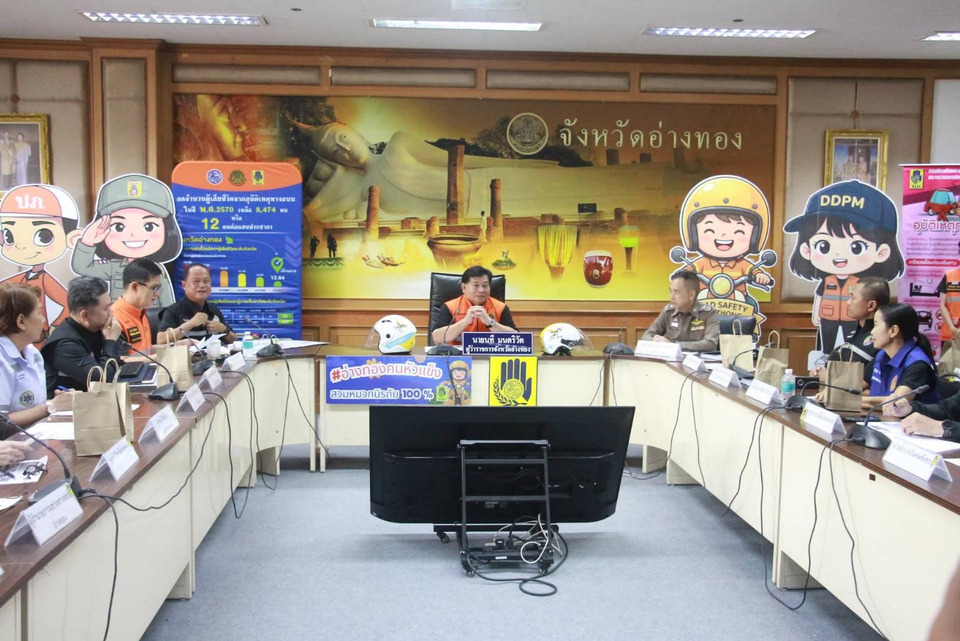 วันที่ 17 เม.ย.69 นายนที มนตริวัต ผู้ว่าราชการจังหวัดอ่างทอง เป็นประธานการประชุมศูนย์ปฏิบัติการป้องกันและลดอุบัติเหตุทางถนนช่วงเทศกาลสงกรานต์ พ.ศ. 2569 จังหวัดอ่างทอง โดยมีนายไพบูลย์ ศุภบุญ รปงผู้ว่า ฯ อ่างทอง/น.ส.สุกัญญา กุลสุวรรณ์ ปลัดจังหวัดอ่างทอง/พล.ต.ต.กิตติ สกุณี ผู้บังคับกาตำรวจภูธรจังหวัดอ่างทอง/พ.อ.ศรัณยนิษฐ์ สุทธิวัจน์ชินเดช รอง ผอ.รมน.จังหวัดอ่างทอง/นายบรรจง โพธิวงค์ หัวหน้าสำนักงานป้องกันและบรรเทาสาธารณภัยจังหวัดอ่างทอง หัวหน้าส่วนราชการ เข้าร่วม ที่ประชุมรายงานสถิติอุบัติเหตุทางถนนช่วงเทศกาลสงกรานต์ 2569 สะสม 7 วัน (10-16 เมษายน 2569) เกิดอุบัติเหตุ 15 ครั้ง ผู้บาดเจ็บ 15 ราย ผู้เสียชีวิต 1 ราย ซึ่งนับว่า ลดลงจากเทศกาลสงกรานต์ปี 2568 ในทุกด้าน