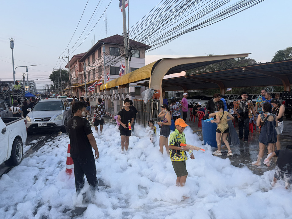 ด้านนักท่องเที่ยวต่างพาลูกหลานขึ้นรถกระบะตั้งถังน้ำออกมาเล่นน้ำสาดน้ำสงกรานต์ ส่วนกลุ่มวัยรุ่นทั้งชายหญิงจำนวนนับร้อยต่างขับขี่รถจยย.คู่ใจ ออกมาเล่นสาดน้ำปะแป้งคลายร้อนกันจนแนานถนนทั้งซอย