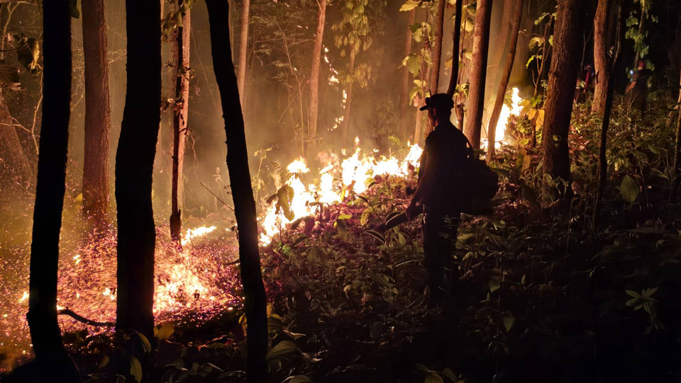 และช่วงบ่าย เจ้าหน้าที่ฯ ได้รับแจ้งจากผู้ใหญ่บ้าน หมู่ที่ ๖ บ้านผาสำราญ ตำบลเมืองแปง อำเภอปาย จังหวัดแม่ฮ่องสอน พบกลุ่มควันขึ้นบริเวณป่าห้วยผักห้า จึงได้นำกำลังเข้าพื้นที่ร่วมกับ ผู้ใหญ่บ้านและชาวบ้านบ้าน พบไฟลุกไหม้เป็นแนวยาวบนสันดอย จึงได้ช่วยกันเข้าควบคุมไฟ สามารถควบคุมไฟได้บางส่วน เนื่องจากไฟขยายเป็นวงกว้าง เจ้าหน้าที่จึงได้นำอากาศยานไร้คนขับ(Drone) ขึ้นบินสำรวจพบแนวไฟเป็นวงกว้างอยู่ในพื้นที่สูงชันยากต่อการเข้าควบคุม จึงได้แบ่งกำลังทำแนวกันไฟป้องกันการลุกลามของไฟป่า พื้นที่ความเสียหายยังไม่สามารถประเมินได้ ไม่ทราบสาเหตุการเกิดไฟ