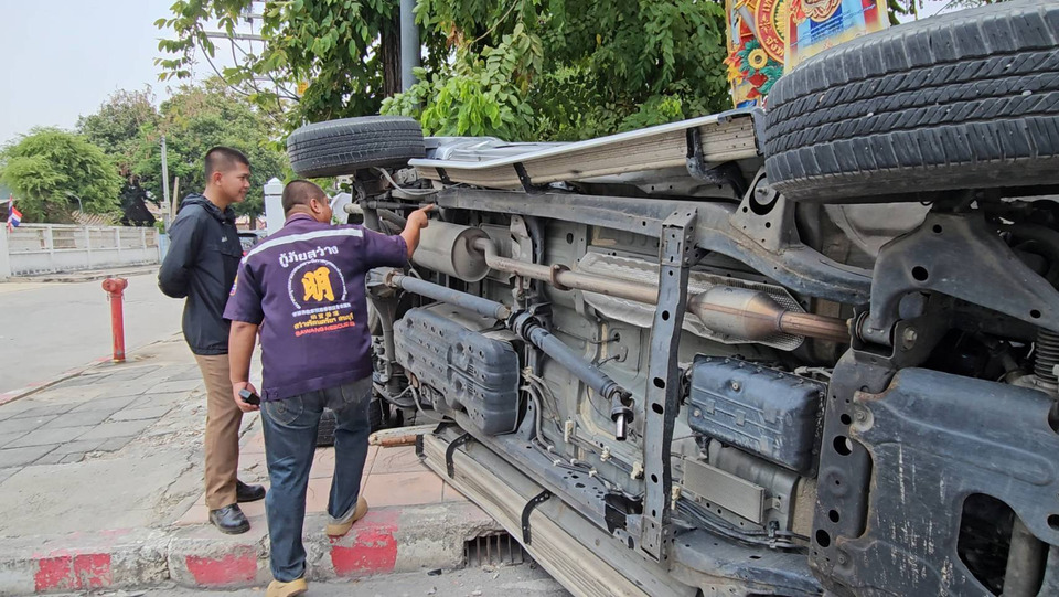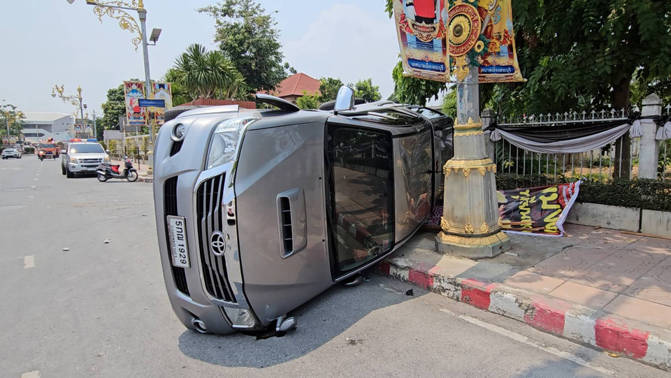 สาวขับ SUV ใช้ GPS พลาด! พุ่งชนกระบะพลิกตะแคงพิงเสาไฟ คนขับกระบะบาดเจ็บ