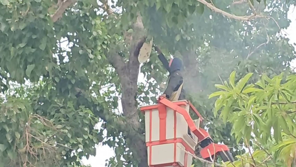 โดยคณะกรรมการวัด พร้อมด้วยเจ้าหน้าที่ อบต. และผู้ใหญ่บ้าน ได้แจ้งไปยังเจ้าหน้าที่กู้ภัยฯ ให้ช่วยมากำจัดรังผึ้งหลวง เกรงว่าจะไล่ต่อยชาวบ้านอีกในคืนนี้ ซึ่งทางเจ้าหน้าที่ได้เตรียมรถกระเช้าเข้ามาเนื่องจากว่ารังของผึ้งอยู่ที่กิ่งโพธิ์ซึ่งสูงกว่าพื้นประมาณ 30 เมตร โดยก่อนการกำจัดรังผึ้งทางนายจำรัส พระวิจิตร รองนายก อบต.ผึ้งรวง ได้จุดธูปบอกกล่าวก่อน หลังจากนั้นเจ้าหน้าที่กู้ภัยฯ ได้นำกิ่งไม้ และใบไม้แห้ง และใบไม้สด มามัดรวมกัน เพื่อที่จะนำไปจุดไฟให้เกิดเป็นควันเพื่อไล่ผึ้ง และใช้ใบไม้ที่มีควันปาดเอาตัวผึ้งออก ก่อนที่จะใช้มีดปาดเอารังผึ้งลงมา โดยใช้เวลาไม่ถึง 10 นาทีก็สามารถกำจัดรังผึ้งหลวงได้สำเร็จ ซึ่งรังผึ้งยังไม่ใหญ่มากนัก คาดว่าผึ้งน่าจะเพิ่งเข้ามาทำรัง เนื่องจากว่าที่รังยังมีหัวน้ำหวานไม่มาก