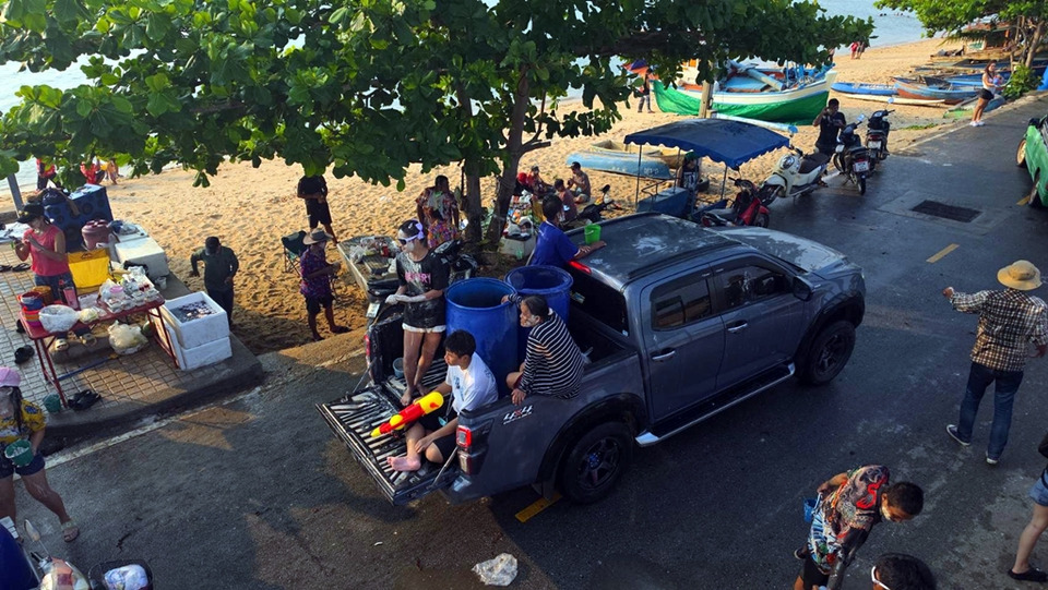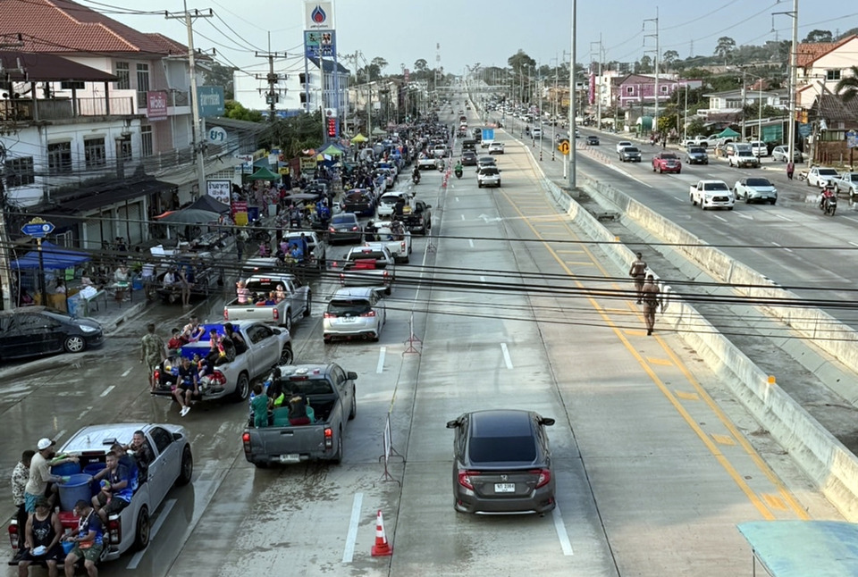 ขณะเดียวกัน ตลอดแนวถนนภายในชุมชน มีประชาชนและนักท่องเที่ยว ทั้งวัยรุ่นและครอบครัว ออกมาเล่นน้ำสงกรานต์กันอย่างสนุกสนาน บางส่วนขับขี่รถจักรยานยนต์ และรถกระบะบรรทุกถังน้ำออกเล่นน้ำ ส่งผลให้การจราจรติดขัดเป็นระยะทางยาว