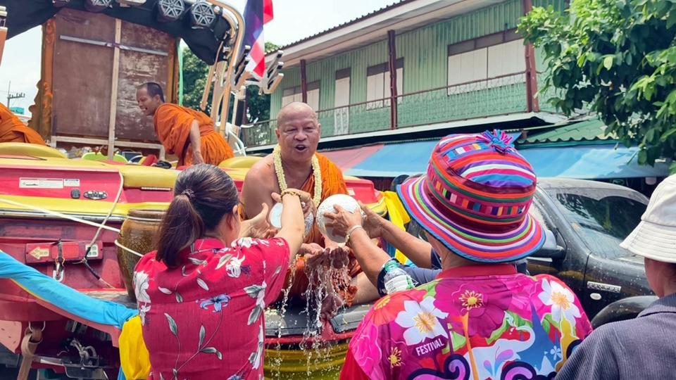 ภายในงานมีการจัดพิธีสรงน้ำพระ เพื่อความเป็นสิริมงคล พร้อมนิมนต์พระครูเกษม กิตติโสภณ หรือ “อาจารย์จ่อย” เจ้าคณะตำบลพลูตาหลวง และเจ้าอาวาสวัดสามัคคีบรรพต ตำบลบางเสร่ รวมถึงอัญเชิญรูปปั้นหลวงพ่อทองอยู่ จันทสาโร อดีตเจ้าอาวาสวัดบางเสร่คงคาราม พระเกจิชื่อดังของพื้นที่ ร่วมขึ้นขบวนแห่ บนเรือสปีดโบ๊ต ซึ่งตั้งอยู่บนสาลี่ และใช้รถยนต์ลากไป ตามถนนภายในชุมชนบางเสร่ เพื่อให้ประชาชนและนักท่องเที่ยวได้ร่วมสรงน้ำ ขอพรตลอดเส้นทาง