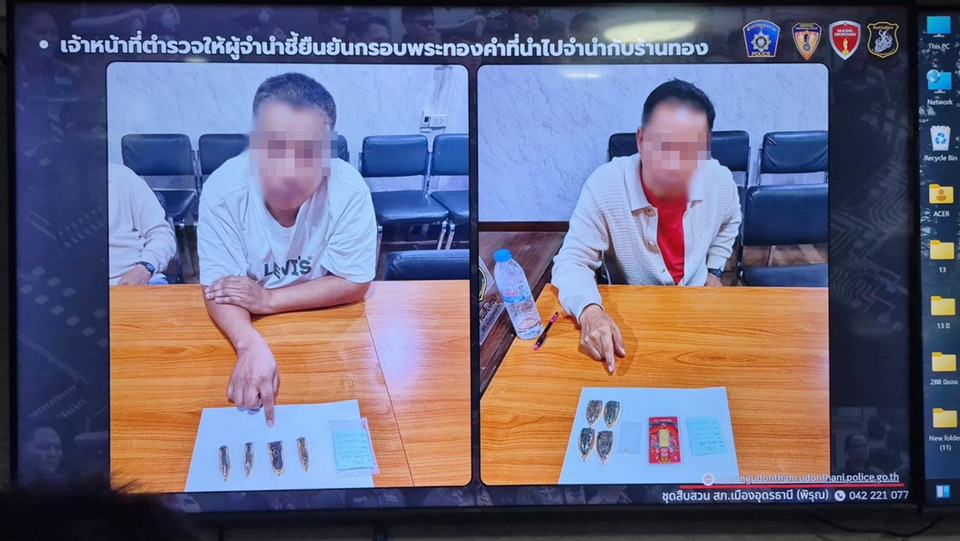 วันที่ 23 เม.ย.69 ผู้สื่อข่าวรายงานว่า พล.ต.ต.ธวัชชัย ถุงเป้า ผบก.ภ.จว.อุดรธานี, พ.ต.อ.ฉกาจ เทีมวงศ์ รองผบก.ภูธร จ.อุดรธานีน, พ.ต.อ.พัฒนวงศ์ จันทร์พล ผกก.สภ.เมืองอุดรธานี เจ้าหน้าที่ตำรวจชุดสืบสวน (ชุดพิรุณ) จับกุมผู้ต้องหาตามหมายจับศาลจังหวัดอุดรธานีได้ 2 ราย คือ นายสุวรรณ อายุ 63 ปี ชาวกรุงเทพมหานคร และนายขวัญนคร อายุ 47 ปี ชาว จ.ปทุมธานี จากการสืบสวนพบว่า ผู้ต้องหาทั้งสองมีพฤติการณ์วางแผนก่อเหตุอย่างแนบเนียน โดยใช้กรอบพระทองคำลักษณะ “ทองยัดไส้” ตระเวนเข้าไปตามร้านทอง ทำทีซื้อขายทองตามปกติเพื่อสร้างความน่าเชื่อถือ ก่อนนำกรอบพระออกสอบถามว่ารับจำนำหรือรับซื้อหรือไม่ เมื่อร้านประเมินราคาและตกลงรับขายฝาก ก็ทยอยนำกรอบพระลักษณะเดียวกันออกมาจำนำครั้งละหลายองค์ บางร้านมากถึง 4-7 องค์ จนเกิดความเสียหายเป็นวงกว้างในพื้นที่ภาคอีสาน