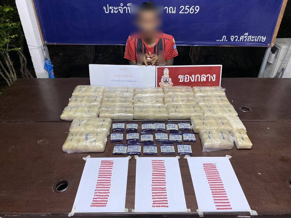 เมื่อวันที่ 24 เม.ย. 2569 ภายใต้การอำนวยการของ นายอนุรัตน์ ธรรมประจำจิต ผวจ.ศรีสะเกษ ในฐานะ ผอ.ศอ.ปส.จ.ศรีสะเกษ พร้อมด้วย พล.ต.ต.ศุภชัย ศักรินพานิชกุล ผบก.ภ.จว.ศรีสะเกษ นายสุริยา บุตรจินดา รอง ผวจ.ศรีสะเกษ นายสะอาด วงศ์รักษ์ ปลัดจังหวัดศรีสะเกษ พล.ต.ต.ชยากร เทศะบำรุง ผู้ทรงคุณวุฒิ ตร.ปฎิบัติราชการ ภ.จว.ศรีสะเกษ อำนวยการและสั่งการให้ชุดปฏิบัติการ 238 พิทักษ์นครลำดวนจังหวัดศรีสะเกษ นำโดย พ.ต.ท.วัชรพล เชียงพฤกษ์ รองผกก.สส.สภ.เมืองจันทร์ และนายสรศิริ จันดีบุตร หัวหน้า ศอ.ปส.จ.ศรีสะเกษ หัวหน้าชุดฯ สนธิกำลังร่วมกันกับ เจ้าหน้าที่ทหาร ฉก.3 กกล.สุรนารี เจ้าหน้าที่เรือนจำจังหวัดศรีสะเกษ และสมาชิก อส. ร่วมกันสืบสวนจับกุมตัวเครือข่ายผู้ค้ายาเสพติดรายสำคัญ ในพื้นที่บริเวณริมถนนสาย 221 ศรีสะเกษ-พยุห์ หมู่ที่ 5 ต.โพนค้อ อ.เมือง จ.ศรีสะเกษ ต่อเนื่องถึงพื้นที่ ต.ตองปิด อ.น้ำเกลี้ยง จ.ศรีสะเกษ โดยสามารถจับกุมตัวผู้ต้องหาได้ จำนวน 1 ราย นายเก้า อายุ 24 ปี ชาว ต.ตองปิด อ.น้ำเกลี้ยง จ.ศรีสะเกษ พร้อมของกลางยาบ้า จำนวน 119,400 เม็ด ซุกซ่อนอยู่หลังบ้านพักในถุงพลาสติกสีดำ