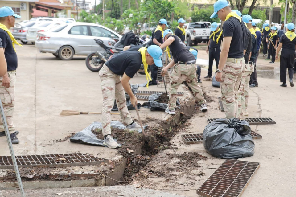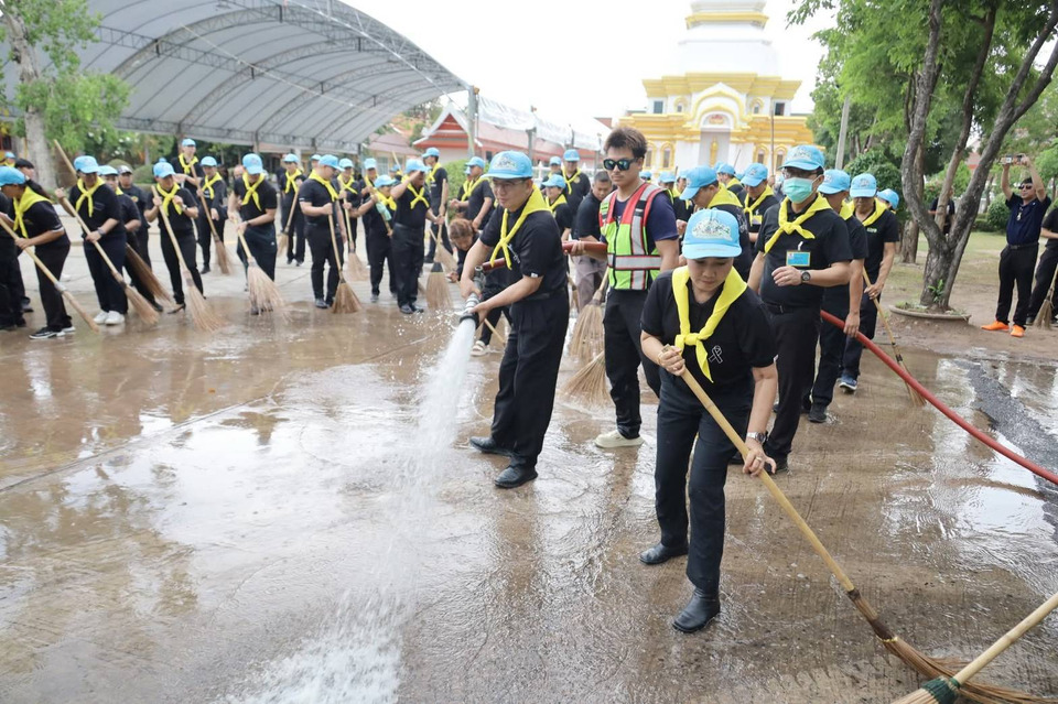 ร่วมกันฉีดน้ำแรงดันสูงล้างพื้นถนนและกวาดน้ำทำความสะอาดพื้นถนนบริเวณวัดประชานิยม พระอารามหลวง พื้นที่รับเสด็จฯ พระบาทสมเด็จพระเจ้าอยู่หัว และสมเด็จพระนางเจ้าฯพระบรมราชินี เสด็จพระราชดำเนินทรงประกอบพิธีตัดหวายลูกนิมิตพระอุโบสถ ณ วัดประชานิยม พระอารามหลวง อำเภอเมืองกาฬสินธุ์ จังหวัดกาฬสินธุ์ ในวันเสาร์ที่ 16 พฤษภาคม 2569