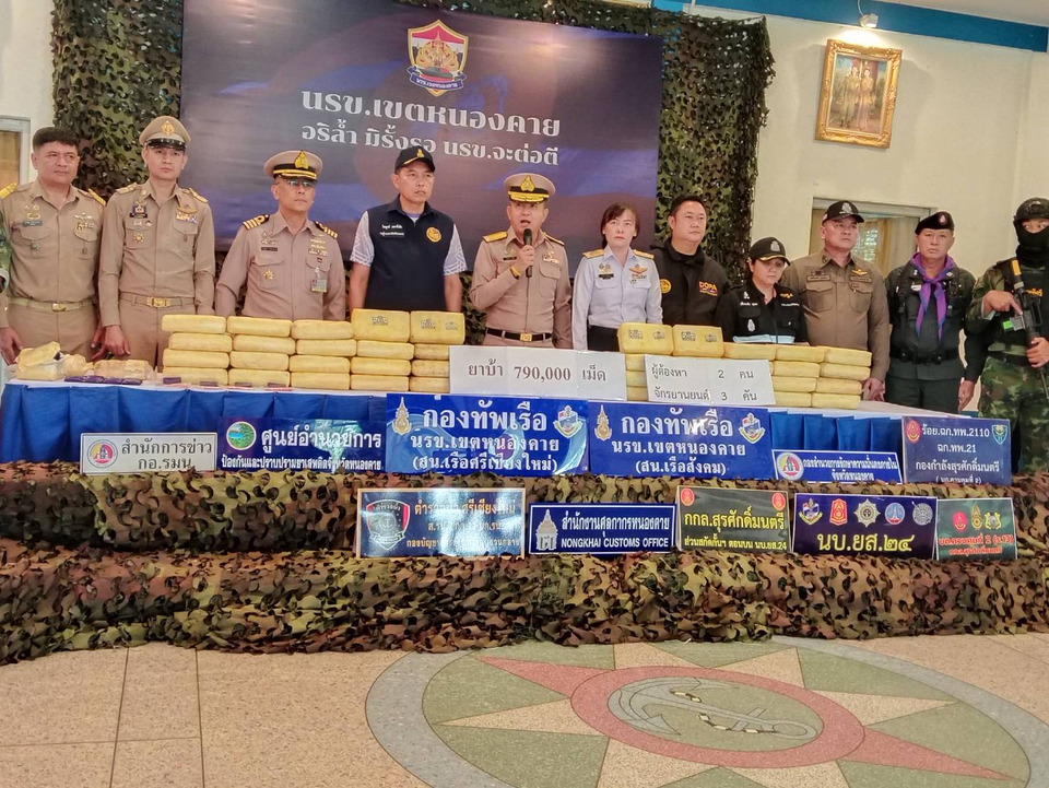 วันที่ 25 เมษายน 2569 หน่วยเรือรักษาความสงบเรียบร้อยตามลำแม่น้ำโขง (นรข.) แถลงผลการจับกุมเครือข่ายค้ายาเสพติดรายใหญ่ “อาเฉิน” พร้อมผู้ต้องหา 2 ราย และของกลางยาบ้าจำนวนกว่า 790,000 เม็ด มูลค่าประมาณ 39 ล้านบาท โดยพล.ร.ต.ณรงค์ เอมดี ผู้บัญชาการหน่วยเรือรักษาความสงบเรียบร้อยตามลำแม่น้ำโขง พร้อมด้วย นายไพฑูรย์ มหาชื่นใจ รองผู้ว่าราชการจังหวัดหนองคาย,น.อ.วิศิษฐ์พงศ์ เจริญวิชยเดช ผบ.นรข.เขตหนองคาย ,นาวาโทคมสัน จ้อยลี หัวหน้าสถานีเรือศรีเชียงใหม่, เรือเอกไพรสน พลเสน หัวหน้าสถานีเรือสังคม , นางสาววรรณา ผู้อุตส่าห์ นายด่านศุลกากรหนองคาย ,นายชัยสิทธิ์ คำภาจันทร์ หน.ศูนย์อำนวยการป้องกันและปราบปรามยาเสพติดจังหวัดหนองคาย ,นายจรัญ กลางประดิษฐ์ นายอำเภอศรีเชียงใหม่ ,ตร.สภ.ศรีเชียงใหม่ และหน่วยงานความมั่นคงในพื้นที่ ได้ร่วมกันแถลงผลการจับกุม 2 ผู้ต้องหา เครือข่าย“อาเฉิน” ขบวนการค้ายาเสพติดรายใหญ่ พร้อมยาบ้า 7.9แสนเม็ด