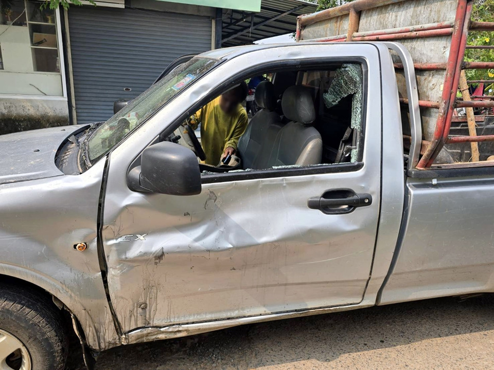 ที่เกิดเหตุเป็นบริเวณ 4 แยก ข้างอบต.ผไทรินทร์ อ.ลำปลายมาศ จ.บุรีรัมย์ ริมถนน 4 เลน สายลำปลายมาศ - หนองหงส์ ช่องจราจรขาเข้าตัว อ.หนองหงส์ พบรถจักรยานยนต์ ยี้ห้อ ยามาฮ่า สีดำ ไม่ติดแผ่นป้ายทะเบียน ล้มอยู่ในสภาพด้านหน้าพังยับเยิน ใกล้กันพบนายศักดิ์สิทธิ (ขอสงวนนามสกุล) อายุ 28 ปี พนักงาน อบต.ผไทรินทร์ คนขับขี่รถจักรยานยนต์บริเวณใบหน้ามีแผลฉีกขาด และนางสาวรวิสรา (ขอสงวนนามสกุล) อายุ 29 ปี พนักงานบริษัทขายรถจักรยานยนต์แห่งหนึ่งใน อ.ลำปลายมาศ คนซ้อนท้ายมีบาดแผลที่บริเวณใบหน้าเช่นกัน เจ้าหน้าที่เร่งปฐมพยาบาลก่อนนำตัวทั้ง 2 คนส่งโรงพยาบาลลำปลายมาศ โดยภายในซอยพบรถยนต์กระบะ ยี้ห้ออีซูซุ สีบรอนซ์เงิน ทะเบียนนครราชสีมา ด้านหลังกระบะพบมีการดัดแปลงติดตั้งโครงเหล็กไว้สำหรับการบรรทุกจอดอยู่โดยฝั่งประตูด้านซ้าย (ฝั่งนั่งข้างคนขับ) ได้รับความเสียหายและกระจกประตูแตกหมดทั้งบาน