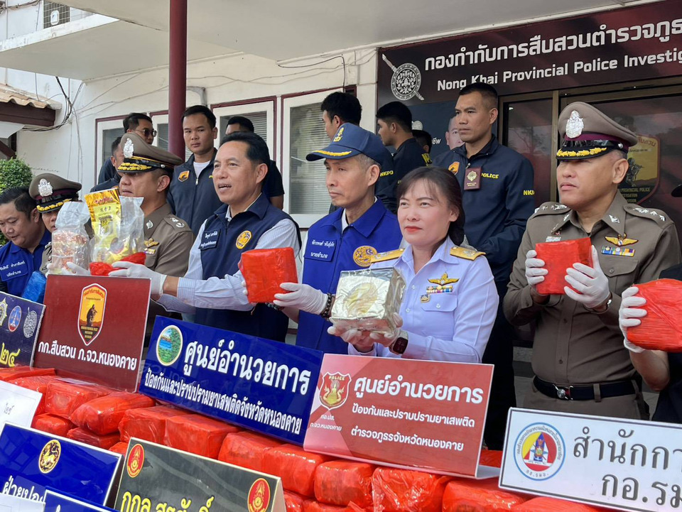 วันที่ 29 เม.ย.69 เวลา 11.30 สน. ที่ด้านหน้า กก.สืบสวน ภ.จว.หนองคาย อ.เมือง จ.หนองคาย นายไพฑรูย์ มหารชื่นใจ รอง ผวจ.หนองคาย พร้อมด้วย พล.ต.ต.อัทธชนม์ ช่วงงาม ผบก.ภ.จว.หนองคาย,พ.ต.อ.ศักดิ์สิทธิ์ บุญเสริม ผกก.สืบสวน ภ.จว.หนองคาย,นายชัยสิทธิ์ คำภาจันทร์ หน.ศูนย์อำนวยการป้องกันและปราบปรามยาเสพติดจังหวัดหนองคาย,นายจักรพงศ์ พันธุ์เพ็ง นอภ.เมืองหนองคาย และเจ้าหน้าที่หน่วยงานที่เกี่ยวข้อง ร่วมกันแถลงข่าวผลการตรวจยึดยาเสพติดให้โทษประเภทที่ 1 (ไอซ์) ซุกในกระเป๋า 7 ใบ รวมจำนวนประมาณ 248 กก. ได้ที่ บริเวณริมฝั่งแม่น้ำโขง หลังวัดราษฎร์จำนงค์ ต.เมืองหมี อ.เมืองหนองคาย ส่วนผู้ต้องหาหลบหนีไปได้