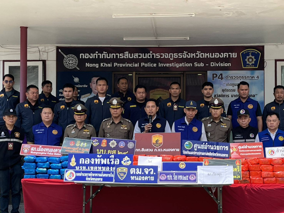สืบเนื่องจากเมื่อวันที่ 28 เม.ย.69 เวลา 01.30 น.ที่ผ่านมา พ.ต.ต.เรวัต รัตนสุรินทร์ สว.กก.สืบสวน ภ.จว.หนองคาย ได้รับแจ้งสายลับว่าจะมีคนลาวนำยาไอซ์ จาก ลาว ขึ้นเรือมาส่งที่บริเวณริมฝั่งโขง หลังวัดราษฎร์จำนงค์ ต.เมืองหมี อ.เมืองหนองคาย จึงได้รายงานให้ พ.ต.อ.ศักดิ์สิทธิ์ บุญเสริม ผกก.สืบสวน ภ.จว.หนองคาย ทราบและได้ประชุมวางแผน จากนั้น พ.ต.ต.เรวัต ฯพร้อมด้วยเจ้าหน้าที่ ตำรวจ ชุดสืบสวน ภ.จว.หนองคาย ได้เดินทางไปตรวจสอบพื้นที่ พบกระเป๋าวางอยู่บริเวณริมถนน จึงได้กระจายกำลังซุ่มดู ต่อมาได้มีรถเก๋งยี่ห้อมิตซูบิชิ ไม่ทราบหมายเลขทะเบียนขับมาจอดที่จุดกระเป๋าวางอยู่ จากนั้นได้มีชาย 2 คนไม่ทราบชื่อลงจากรถ และช่วยกันขนกระเป๋าขึ้นรถ ส่วนอีก 1 คน ซึ่งเป็นคนขับนั่งอยู่ในรถ เจ้าหน้าที่ตำรวจจึงได้แสดงตัว ชายทั้ง 2 คน ตกใจวิ่งหลบหนี เจ้าหน้าที่ตำรวจได้วิ่งไล่ติดตามแต่ไม่ทัน เจ้าหน้าที่ตำรวจ จึงได้ทำการตรวจสอบเบื้องต้นพบกระเป๋า 5 ใบ ข้างในซุกยาเสพติด ส่วนรถเก๋งคันดังกล่าวได้ขับหลบหนีไป เจ้าหน้าที่ตำรวจได้ขับรถติดตาม จนกระทั่งถึงบริเวณริมถนนท่าดอกคำ-โคกแมงเงา ตรงข้ามร้านก๋วยเตี๋ยวก่อนถึงปั๊มน้ำมัน ม.3 ต.เมืองหมี อ.เมืองหนองคาย พบกระเป๋า 2 ใบ วางอยู่ จึงได้ทำการตรวจสอบพบว่าด้านในซุกยาเสพติด เจ้าหน้าที่ตำรวจ กก.สืบสวน ภ.จว.หนองคาย และเจ้าหน้าที่ตำรวจ สภ.เวียงคุก จึงได้ร่วมกันตรวจยึดนำมาตรวจนับอย่างละเอียดที่ สภ.เวียงคุก รวมยาเสพติดให้โทษประเภท 1 ยาไอซ์ ทั้ง 7 กระสอบ จำนวนประมาณ 248 กก.จากนั้นได้นำส่ง พนักงานสอบสวน สภ.เวียงคุก เพื่อดำเนินการต่อไป