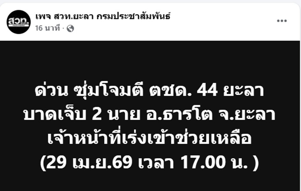 เมื่อวันที่ 29เม.ย.69 เพจ สวท.ยะลา กรมประชาสัมพันธ์ โพสต์ข้อความระบุว่า