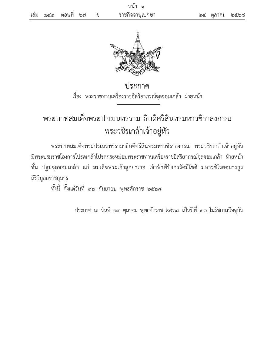วันที่ 25 ตุลาคม 2568 ผู้สื่อข่าวรายงานว่า เว็บไซต์ ราชกิจจานุเบกษา เผยแพร่ประกาศ เรื่อง พระราชทานเครื่องราชอิสริยากรณ์จุลจอมเกล้า ฝ่ายหน้า ความว่า