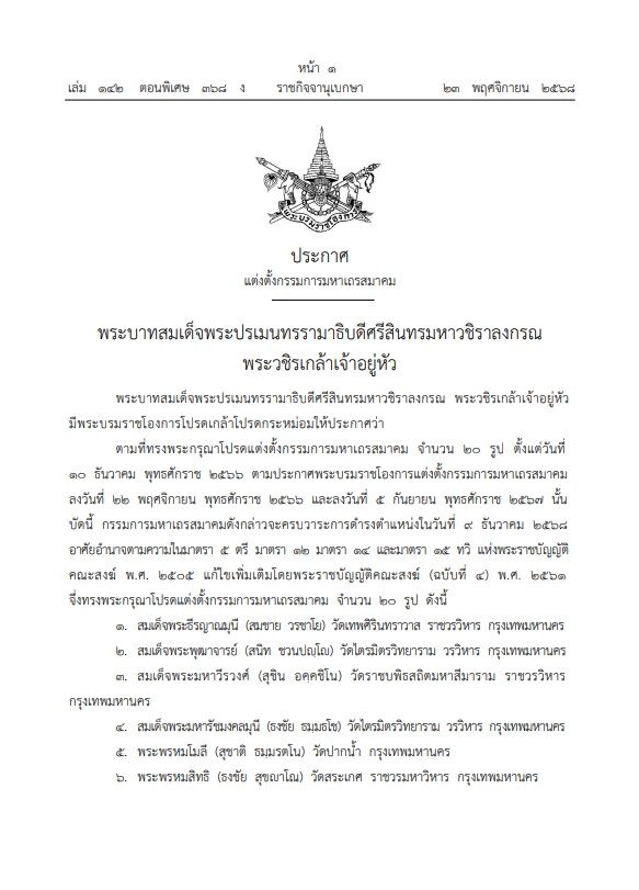 วันที่ 23 พฤศจิกายน ราชกิจจานุเบกษา เผยแพร่พระบรมราชโองการ ประกาศแต่งตั้งกรรมการมหาเถรสมาคม (มส.) ระบุว่า พระบาทสมเด็จพระปรเมนทรรามาธิบดีศรีสินทรมหาวชิราลงกรณ พระวชิรเกล้าเจ้าอยู่หัว มีพระบรมราชโองการโปรดเกล้าโปรดกระหม่อมให้ประกาศว่า