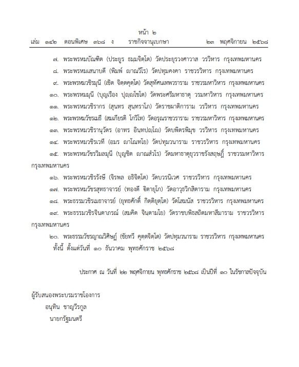 ทั้งนี้ตั้งแต่วันที่ 10 ธันวาคม 2568 ประกาศ ณ วันที่ 22 พฤศจิกายน 2568 เป็นปีที่ 10 ในรัชกาลปัจจุบัน ลงนามโดย นายอนุทิน ชาญวีรกูล นายกรัฐมนตรี