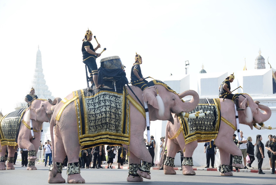 เมื่อประชาชนลุกขึ้นยืนหลังการถวายสักการะเสร็จสิ้นในเวลา 09.43 น. ขบวนช้างเริ่มปรับแถวในเวลา 09.44 น. โดยหันหลังให้พระบรมมหาราชวังและพระบรมฉายาลักษณ์ ในหลวงรัชกาลที่ 9 ช้างทั้ง 11 เชือกยืนเรียงราย พร้อมยกงวงขึ้นเหนือหัวอย่างพร้อมเพรียงกัน เป็นภาพที่งดงาม เพื่อให้ประชาชนได้ถ่ายภาพที่ระลึก โดยมีฉากด้านหลังเป็นพระบรมมหาราชวังและวัดพระแก้ว ภาพเหตุการณ์นี้ได้รับความสนใจอย่างมากจากทั้งชาวไทยและชาวต่างชาติ
