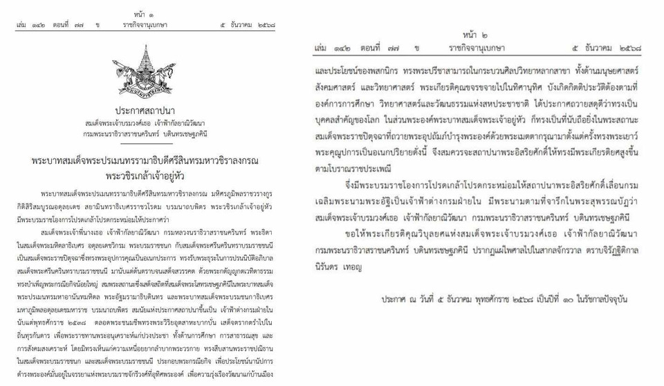 วันที่ 5 ธ.ค.68 เว็บไซต์ราชกิจจานุเบกษา เผยแพร่พระบรมราชโองการ ประกาศสถาปนา สมเด็จพระเจ้าบรมวงศ์เธอ เจ้าฟ้ากัลยาณิวัฒนา กรมพระนราธิวาสราชนครินทร์ บดินทรเชษฐภคินี