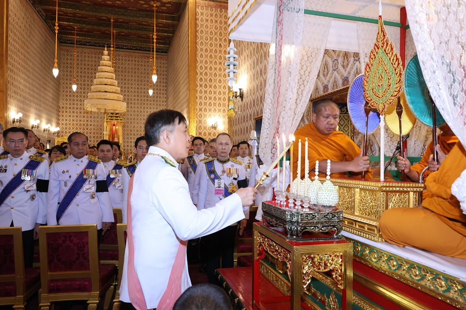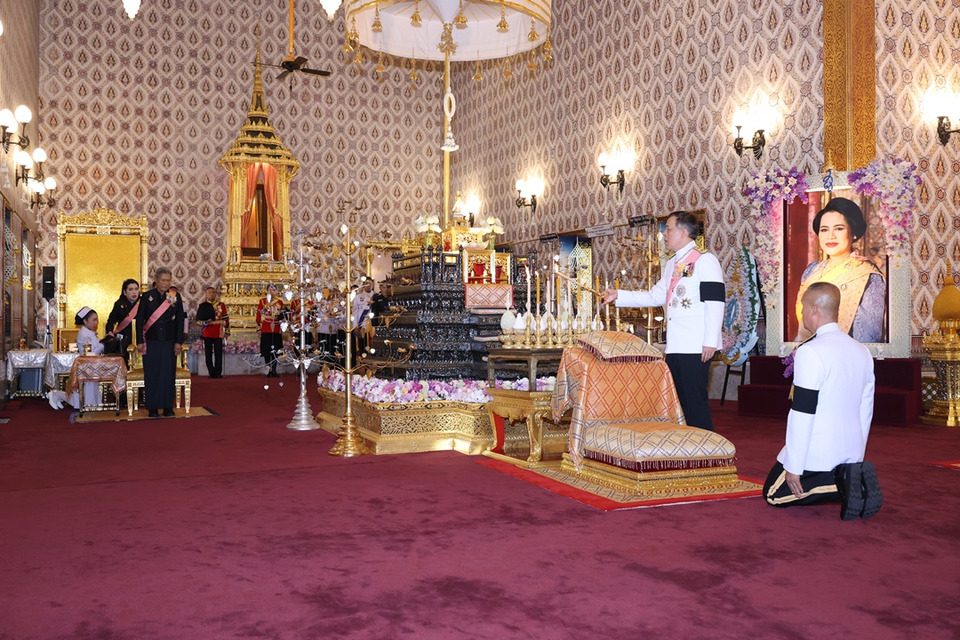 ทรงจุดธูปเทียนเครื่องราชสักการะทองลงยารอง และทรงจุดธูปเทียนเครื่องทองน้อยที่หน้าพระโกศพระบรมศพ สมเด็จพระนางเจ้าสิริกิติ์ พระบรมราชินีนาถ พระบรมราชชนนีพันปีหลวง จากนั้น พระบาทสมเด็จพระเจ้าอยู่หัว ทรงจุดธูปเทียนเครื่องนมัสการพานทองสองชั้นบูชาพระพุทธรูปประจำพระชนมวารที่หน้าพระแท่นพระนพปฎลมหาเศวตฉัตร ทรงกราบ แล้วประทับพระราชอาสน์ สมเด็จพระอริยวงศาคตญาณ สมเด็จพระสังฆราช สกลมหาสังฆปริณายก ถวายศีล